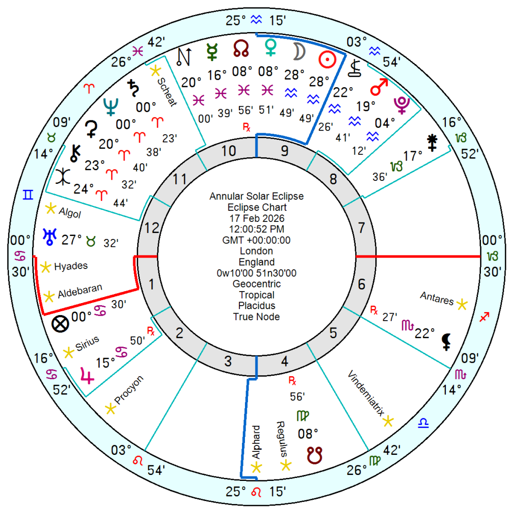 The 17 February Solar Eclipse at 28 Aquarius has the New Moon square Uranus conjunct the destructive Fixed star Algol for a turbulent mood especially since Mars is also in an explosive square to Uranus Algol; and the exact Neptune Saturn conjunction is still conjunct the shipwrecking Scheat. This will be in effect beforehand over late January when there is a build up of tension from transiting Sun Mars in Aquarius conjunct Pluto. The Saros Series of 10 North points to communication, though with frustrations and low energy.