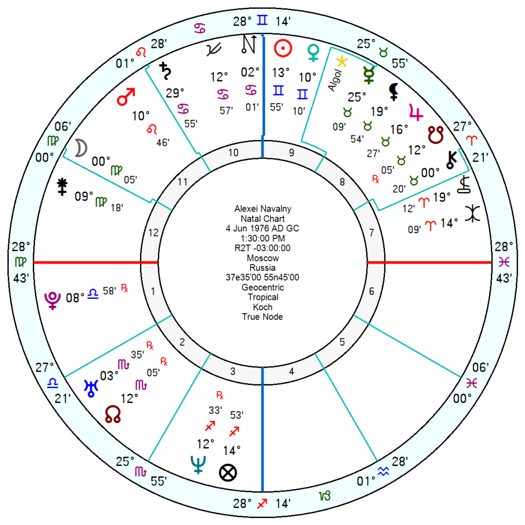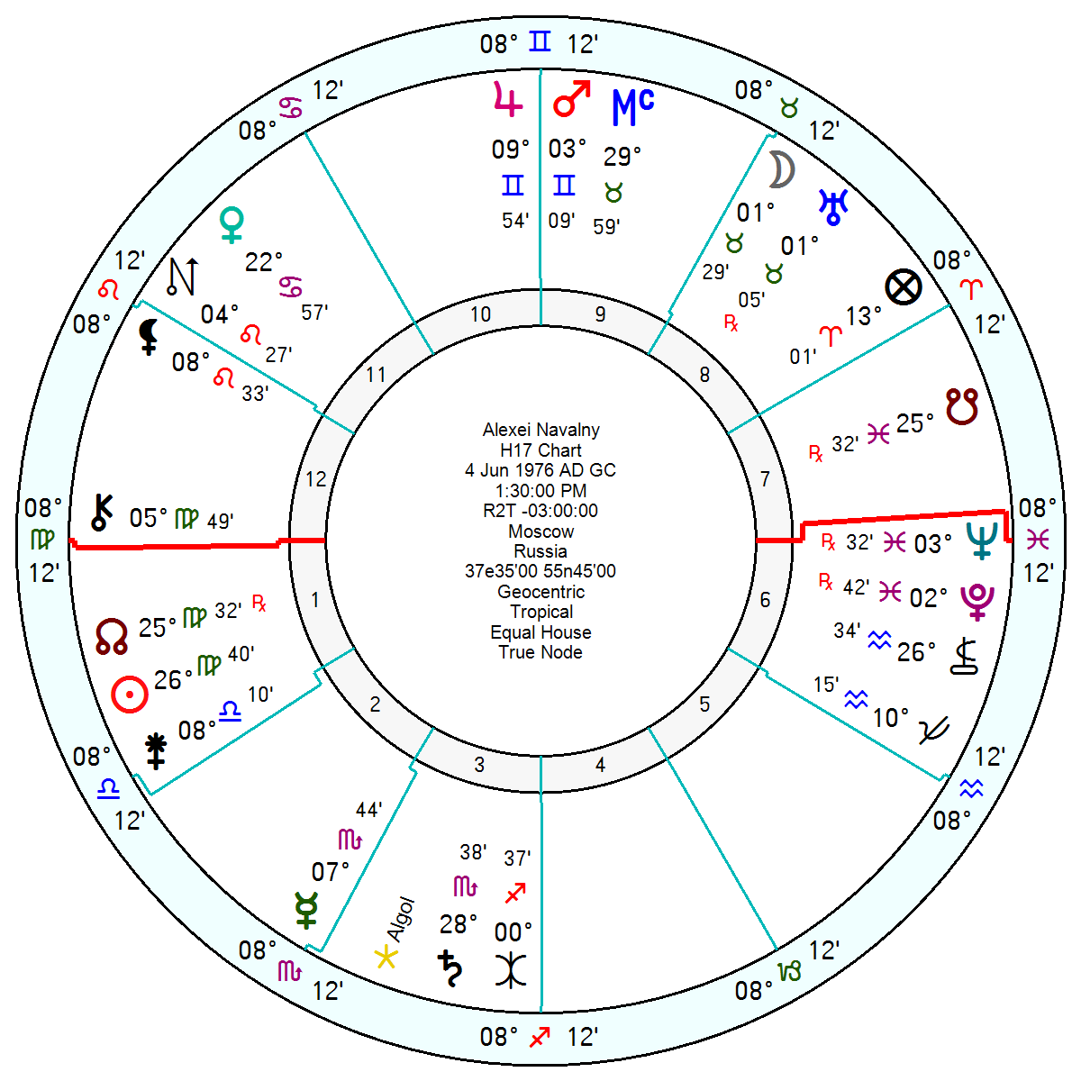 An 8th house Jupiter would also be a motivator for Navalny, giving him a profound (if misplaced) sense of having the luck of the gods behind him. His Chiron in Taurus on the cusp of his 8th and even more so his Scorpio North Node in his 2nd point to an obsessive intensity. The Scorpio North Node and the 8th house can suggest the road to enlightenment or transformation comes through giving up everything and starting again. Though not usually in quite as dramatic or tragic a fashion as his circumstances. His Scorpio North Node was conjunct the Russia 1917 chart Sun – so he might well have seen his salvation lay through rescuing his motherland.