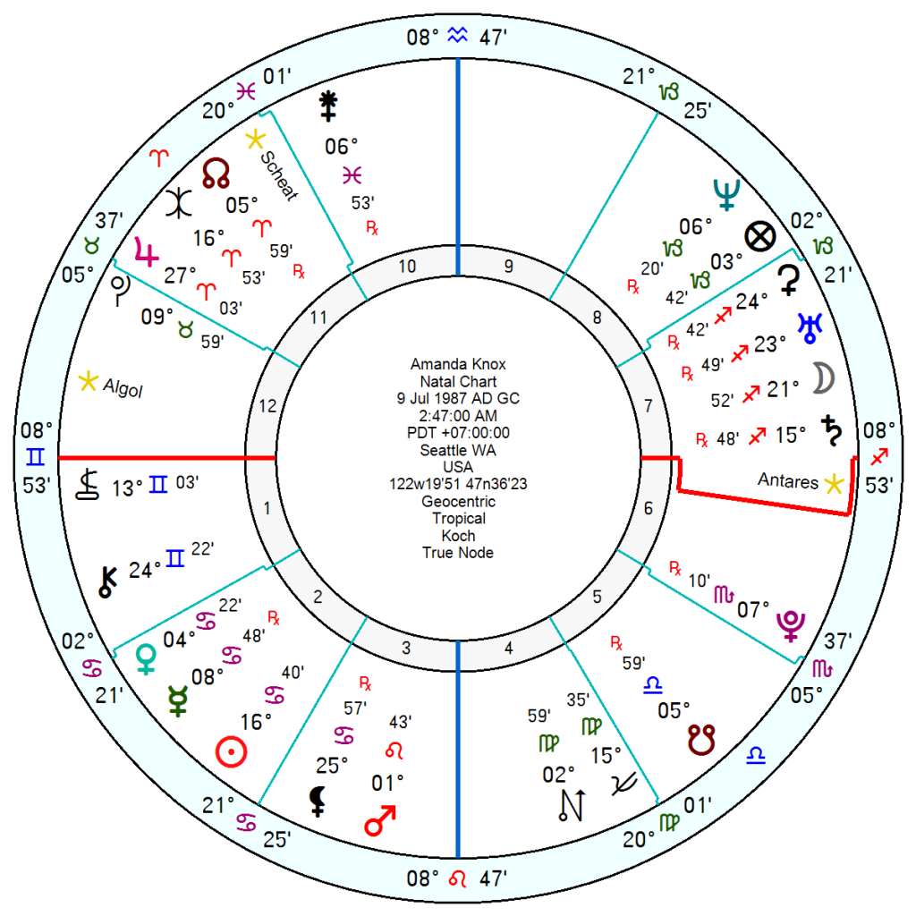 She was born 9 July 1987 2.47am Seattle, VA, and two aspects leap out immediately. The first is her 8th house Neptune (conjunct Part of Fortune) opposition Venus Mercury and widely opposition Sun in Cancer in her 2nd house of finances. It brings to mind Martin Moritz’s description of the 8th house – “associated with entanglements, power games, boundary crossings, or dealing with taboos.” “It is almost impossible to differentiate between good and evil, black and white, hero and villain. Things are muddled and mixed up.” And Neptune there muddies the water further. Not that it is her fault remotely but it is the fate she was handed.