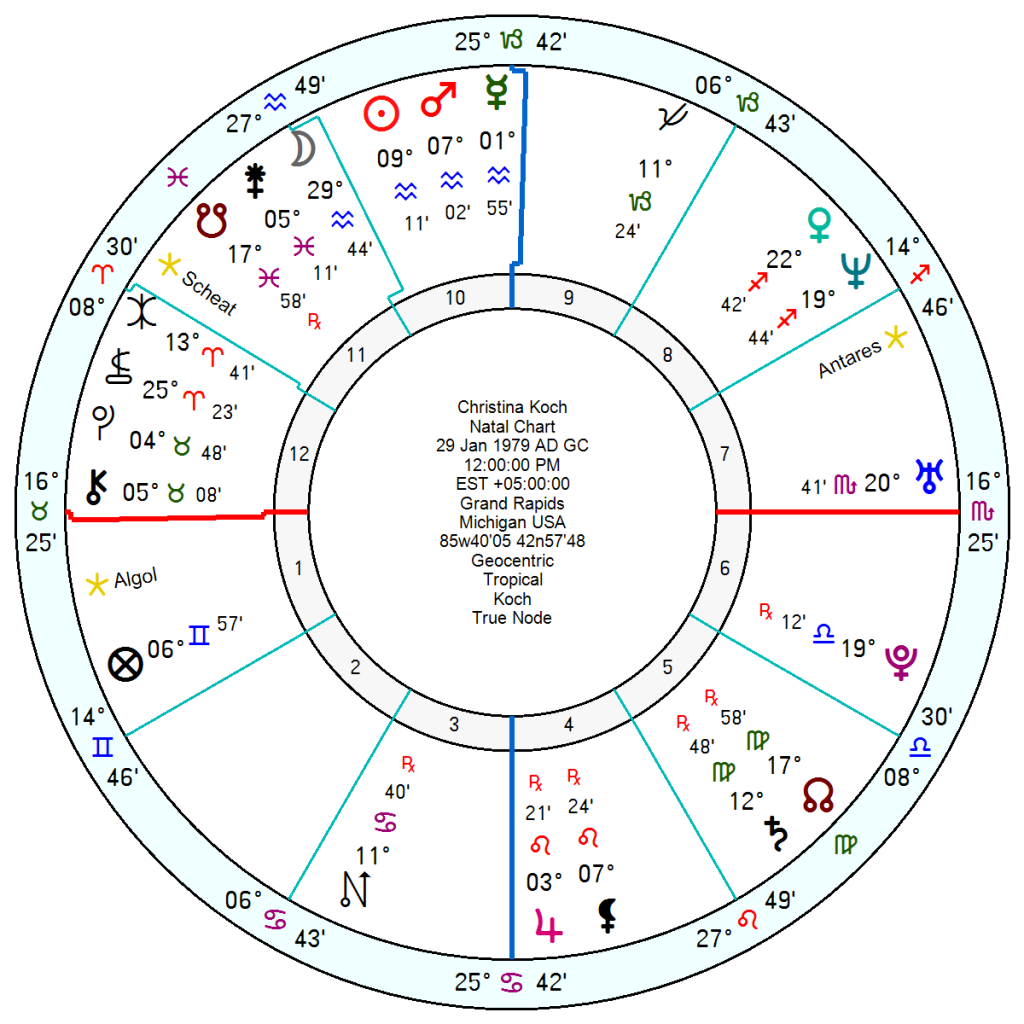Christina Koch, 29 January 1979, is a Sun, Mars, Mercury in Aquarius opposition Jupiter in Leo with Uranus in Scorpio.