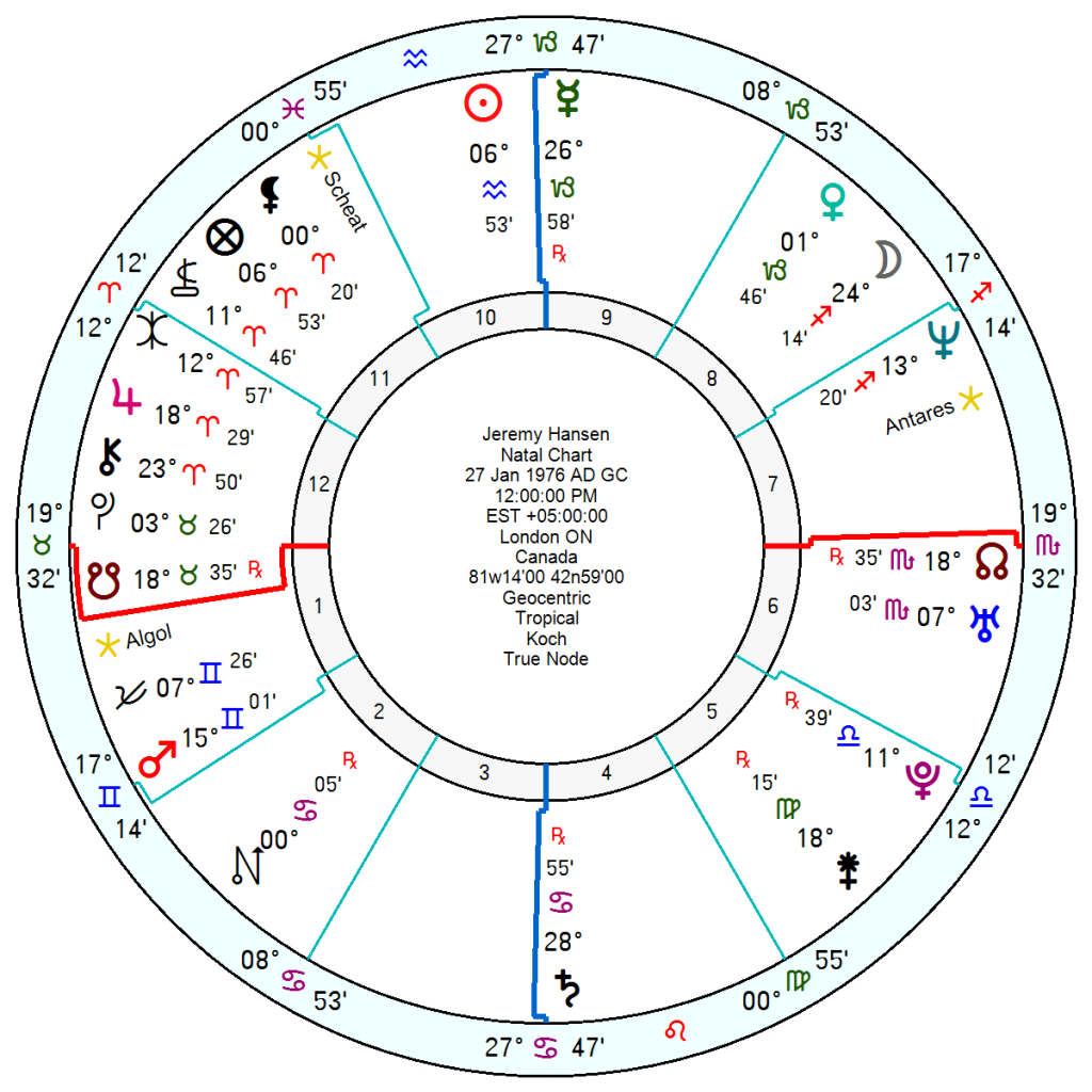 Hansen has an incredibly strong and confident chart with his Pluto trine Mars trine Sun, with his Pluto opposition Jupiter and his Mars opposition Neptune and his Sun opposition Saturn in late Cancer.