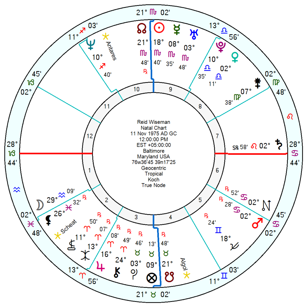 In this instance two astrological themes are marked in the Artemis 11 crew. The first is the proliferation of Fixed signs The commander Reid Weisman, 11 November 1975, is a Sun, Mercury Uranus in Scorpio with the latter two planets square Saturn in Leo.