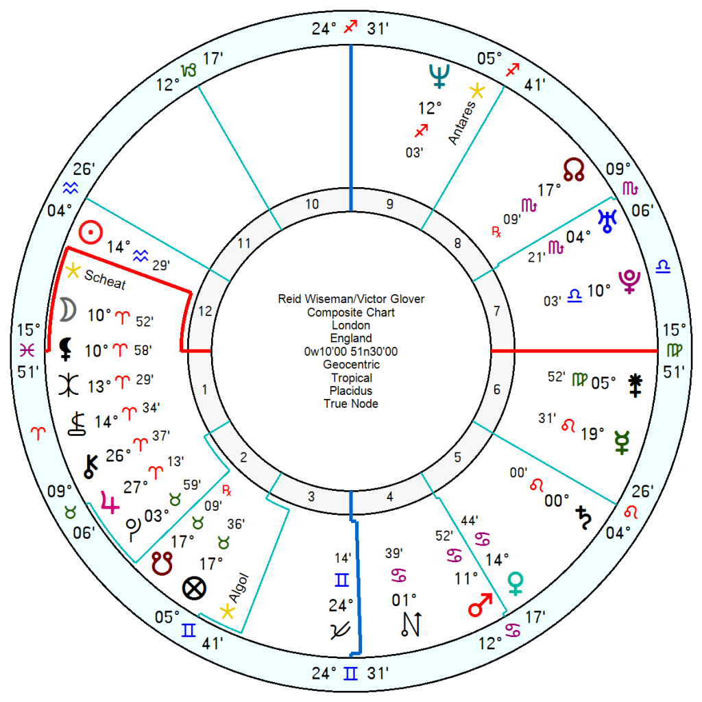 There is also unsurprisingly a marked Uranus presence both natally and in the relationship charts. Again in mundane everyday life, Uranus can be tricky – uncooperative and rebellious, not suited to close team work. But here the Uranian nature of the environment and project should absorb the difficult side of the energy.