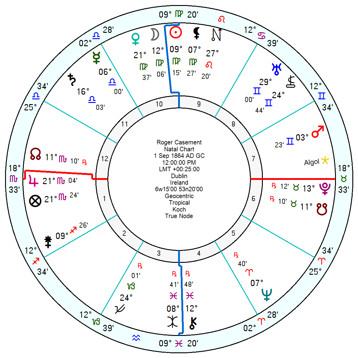 He was born 1 September 1864 in Dublin and was a Sun (Moon) in Virgo in a determined trine to Pluto, opposition Eris (conflict and catalyst) square a pro-active and communicative Mars in Gemini. His Pluto was in a super-confident, anti-authoritarian opposition to Jupiter; and his Neptune in Libra opposed Saturn and Mercury in Libra giving him a drive to improve society. With Uranus in final degree Gemini in a can-be-fanatical and rebellious square to his Neptune and Mercury.