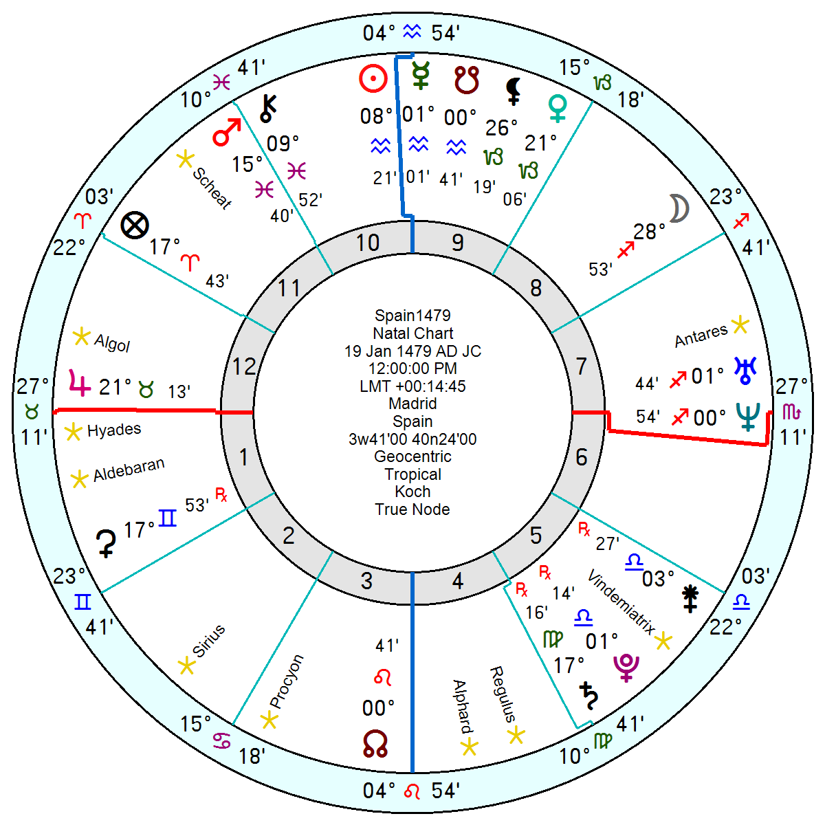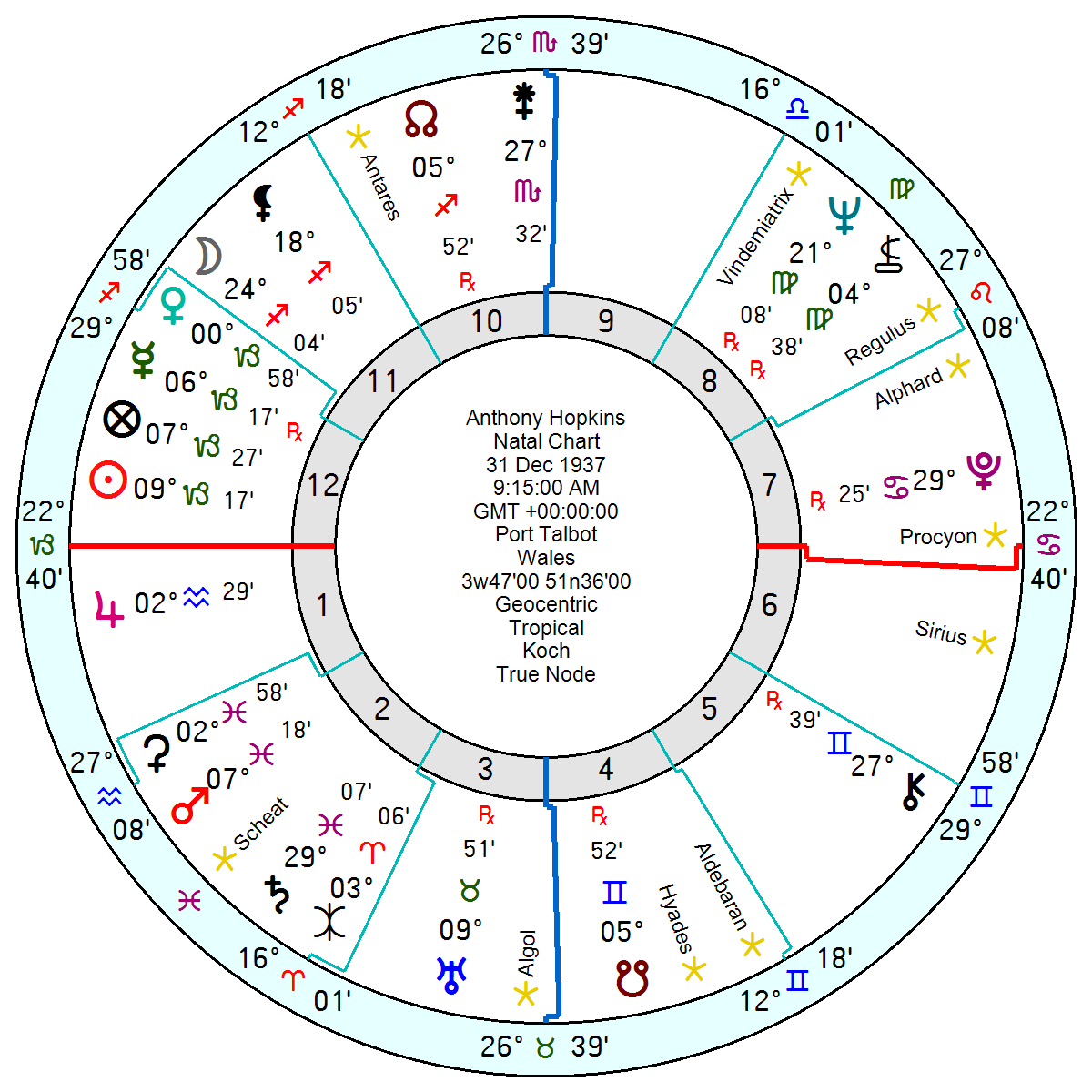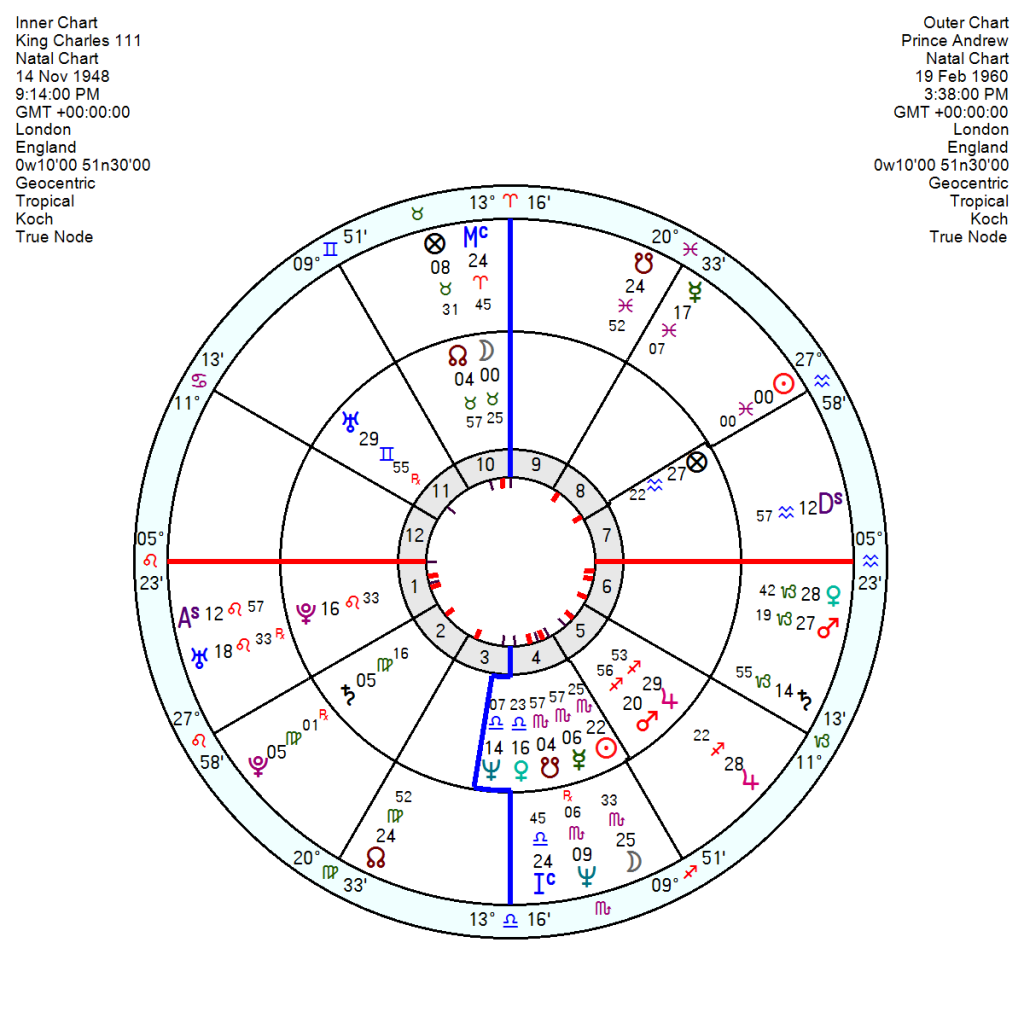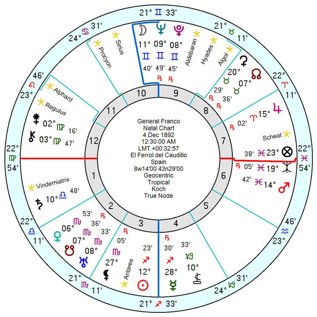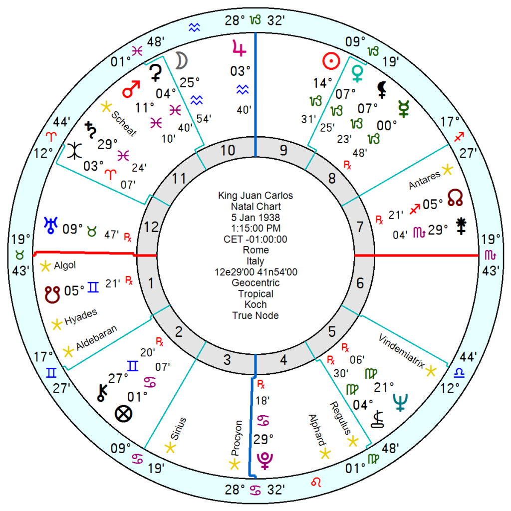 Juan Carlos was born January 5 1938 1.15am Rome, Italy, and has a far-travelled 9th house Capricorn Sun and Venus, with Mercury also in Capricorn in his 8th. He lacks Anthony Hopkin’s creative Water Grand Trine though does have the bleak Pluto in Cancer trine Saturn in Pisces. There is an earthier feel to Juan Carlos’s chart with a Capricorn Midheaven, a Taurus Ascendant with his wayward 12th house Uranus in Taurus trine his Sun and two other Capricorn planets. Earth can be indulgent and acquisitive. His Jupiter in Aquarius in his 10th close to his Midheaven points to high status, luck plus a degree of arrogance and self-righteousness especially in opposition to his Pluto on his IC.