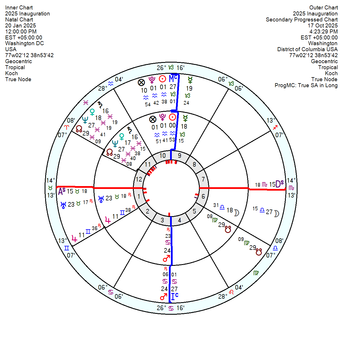 Trump’s Inauguration chart with its bullying, vengeful Sun Pluto opposition Mars – also has a shouty, excitable Mars opposition a 9th house Mercury square a 6th house Moon. The focal point Moon in the 6th highlights health care, as well as civil service (government jobs) and miliary employees – with the 9th house Mercury pulling legal affairs into the mix. The Progressed Moon is continuing to close the T square to Sun Pluto to exact around next March 2026 – so a point worth watching for.