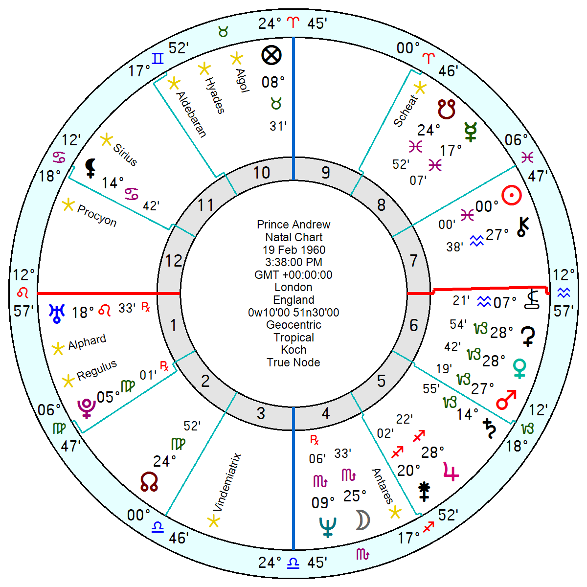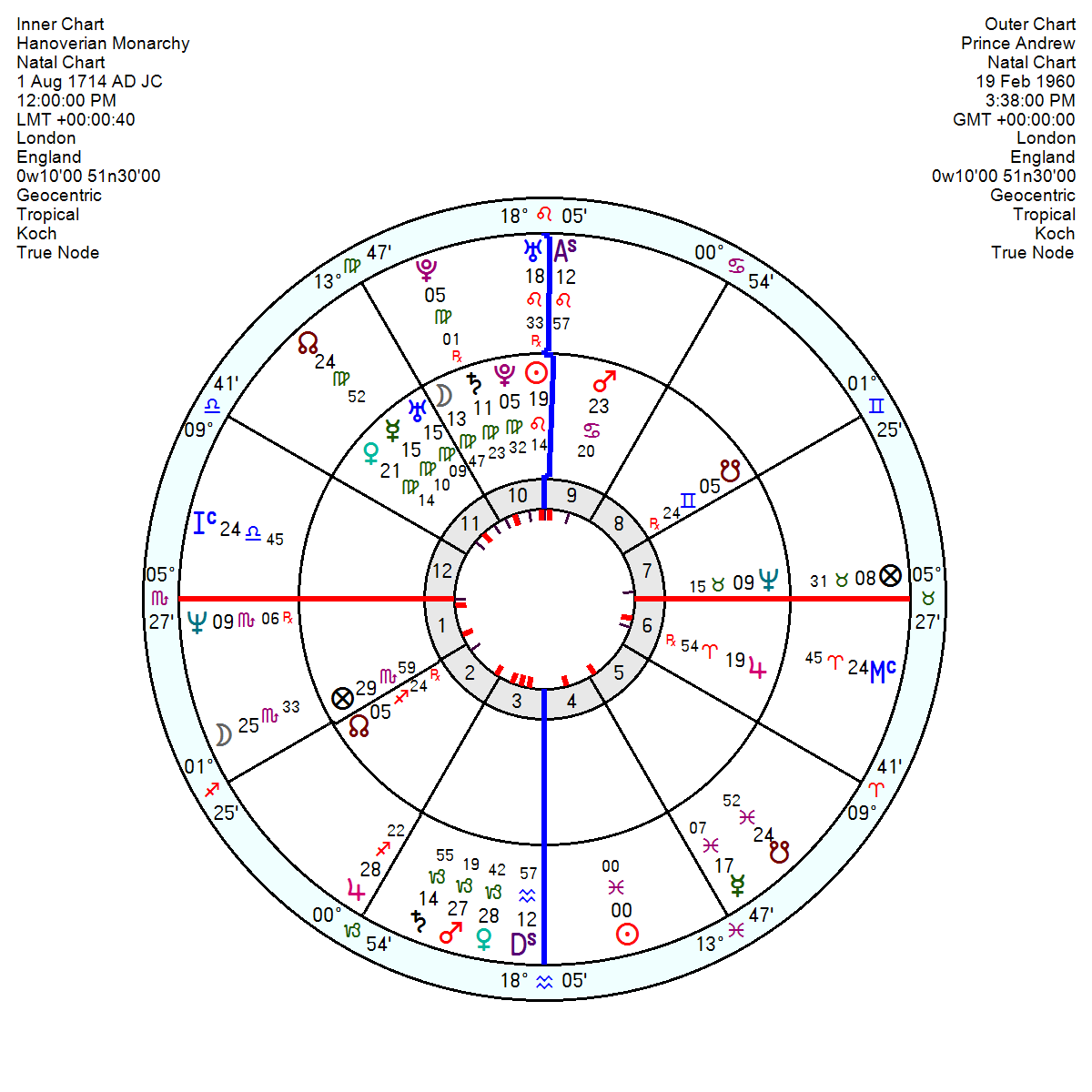 Playing with numbers always throws up odd coincidences but Andrew’s chart does seem unduly intertwined with key figures, for a disgraced and not noticeably talented or valuable member of the family. The original Hanoverian chart, for the Germanic line of the Royals which replaced the House of Stuart when George 1 was crowned in 1714 – launched when Pluto was in early Virgo, exactly as is the case with Prince Andrew, with its Neptune in Taurus exactly opposition his Neptune in Scorpio – plus his Uranus conjunct the Hanoverian Sun.