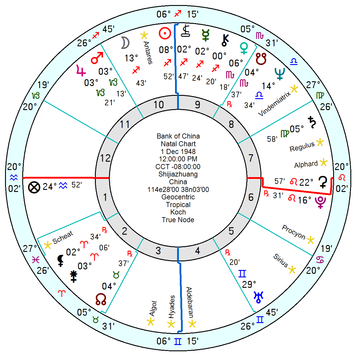 In the midst of a range of imponderables the Bank of China chart, 1 December 1948, is heading for a bubble-bursting downturn in 2026/27 when tr Saturn Neptune square the BofC Mars Jupiter in Capricorn exacerbated by Solar Arc Neptune conjunct as well. 2026/27 will have its own set of financial challenges extending on for two years.