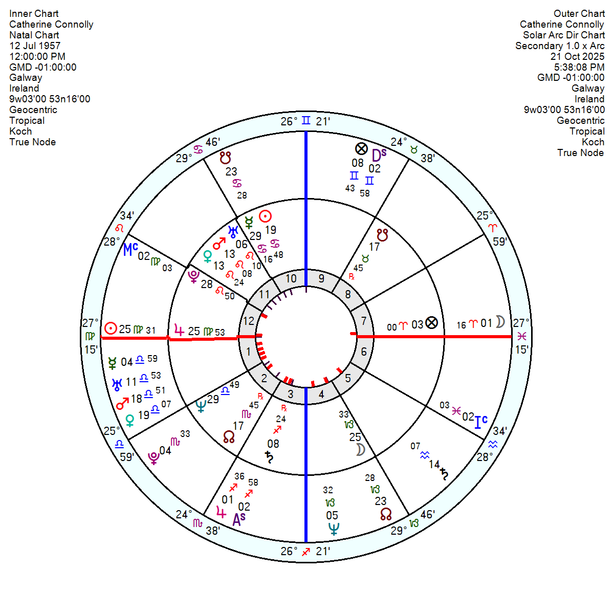 Catherine Connolly, 12 July 1957, Galway, is a Sun Cancer Capricorn Moon with a flamboyant Leo stellium of Uranus, Mars, Venus trine Saturn in Sagittarius, with Pluto in Leo as well. Her Mercury in Cancer is in an evasive square to Neptune. Cancer will give her a nose for whatever is popular in the culture. Leo hints at a need for an audience. Her Saturn in knowledgeable and know-it-all Sagittarius trine her Uranus, Mars, Venus will tone down the flamboyance of Leo and leave her with a ready supply of opinions. Her Jupiter in workmanlike Virgo does have her Solar Arc conjunct this year for a confidence high. Though tr Pluto may (birth time depending) be throwing a spanner in the works where one of her Mars midpoints are concerned until early December.