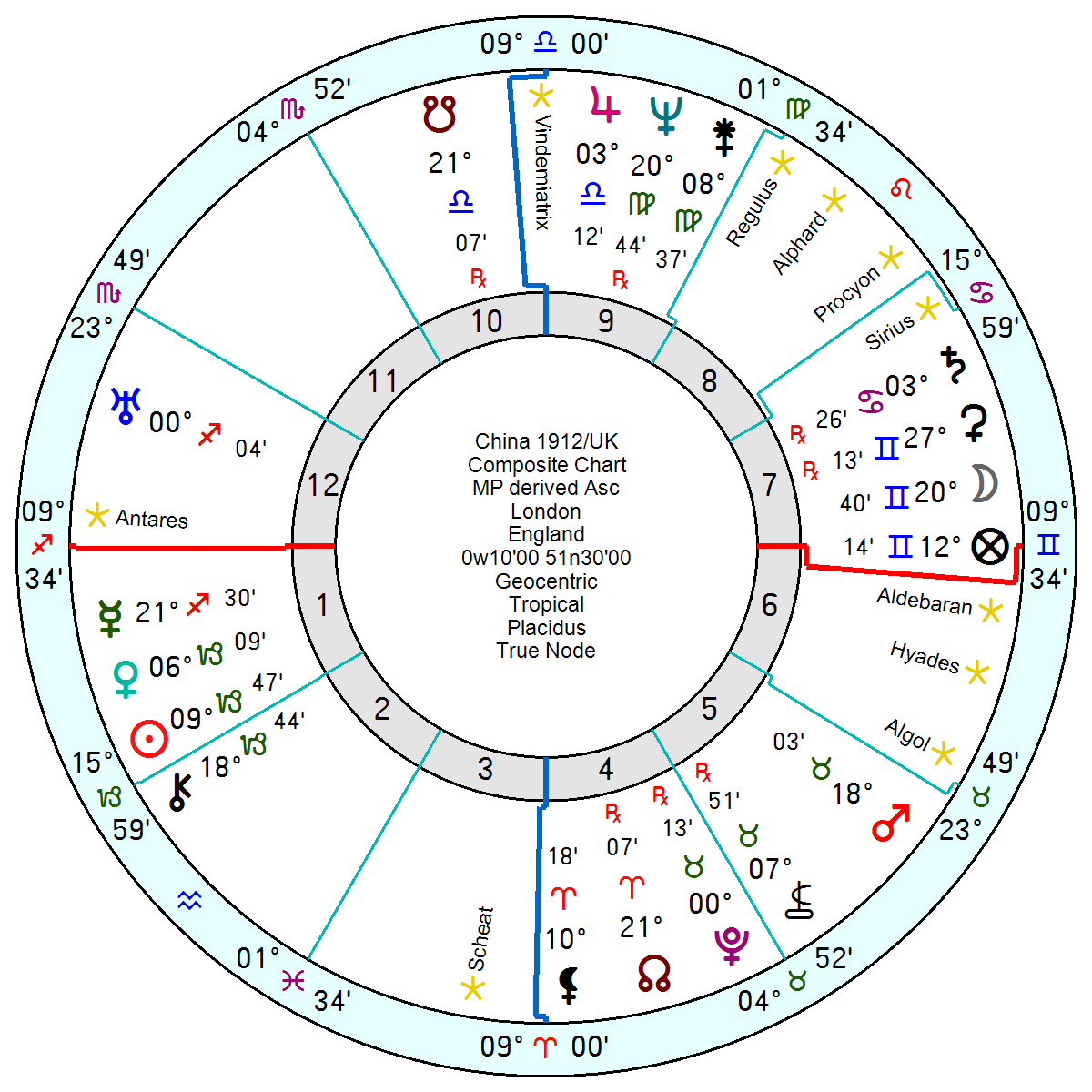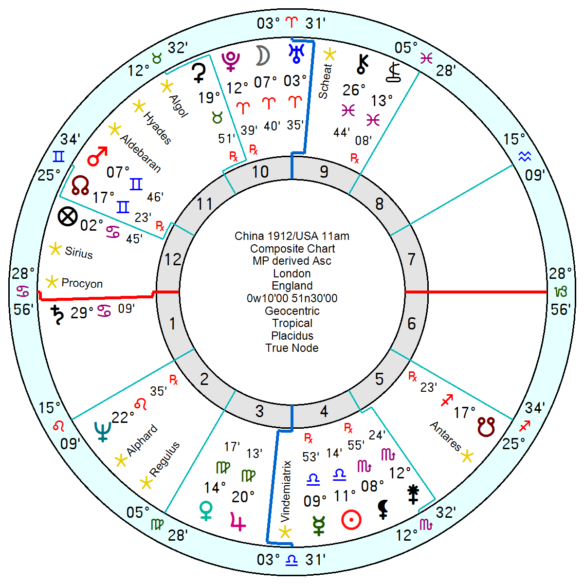 The China 1 January 1912 chart will be blocked early October this year and January 2026 with tr Saturn square the Pluto; facing a degree of chaos in 2026 with SA Pluto square the Neptune which could be a major natural disaster amongst other effects. With some luck from tr Uranus opposition Jupiter; but heading into high insecurity and perhaps high risk in 2027 as the SA Uranus is conjunct Mars.