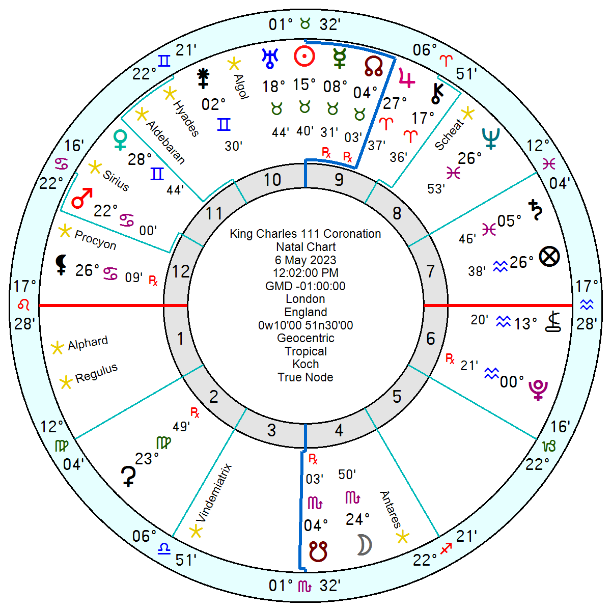 King Charles’ Coronation chart, 6 May 2023 12.02pm with its 17 Leo Ascendant and 18 degree Uranus in Taurus in the 10th conjunct Sun set out to be a monarchy of progressive change – and yet Andrew has become a wrecking ball in the machinery. His Uranus sits on the Coronation Ascendant, damaging its image.