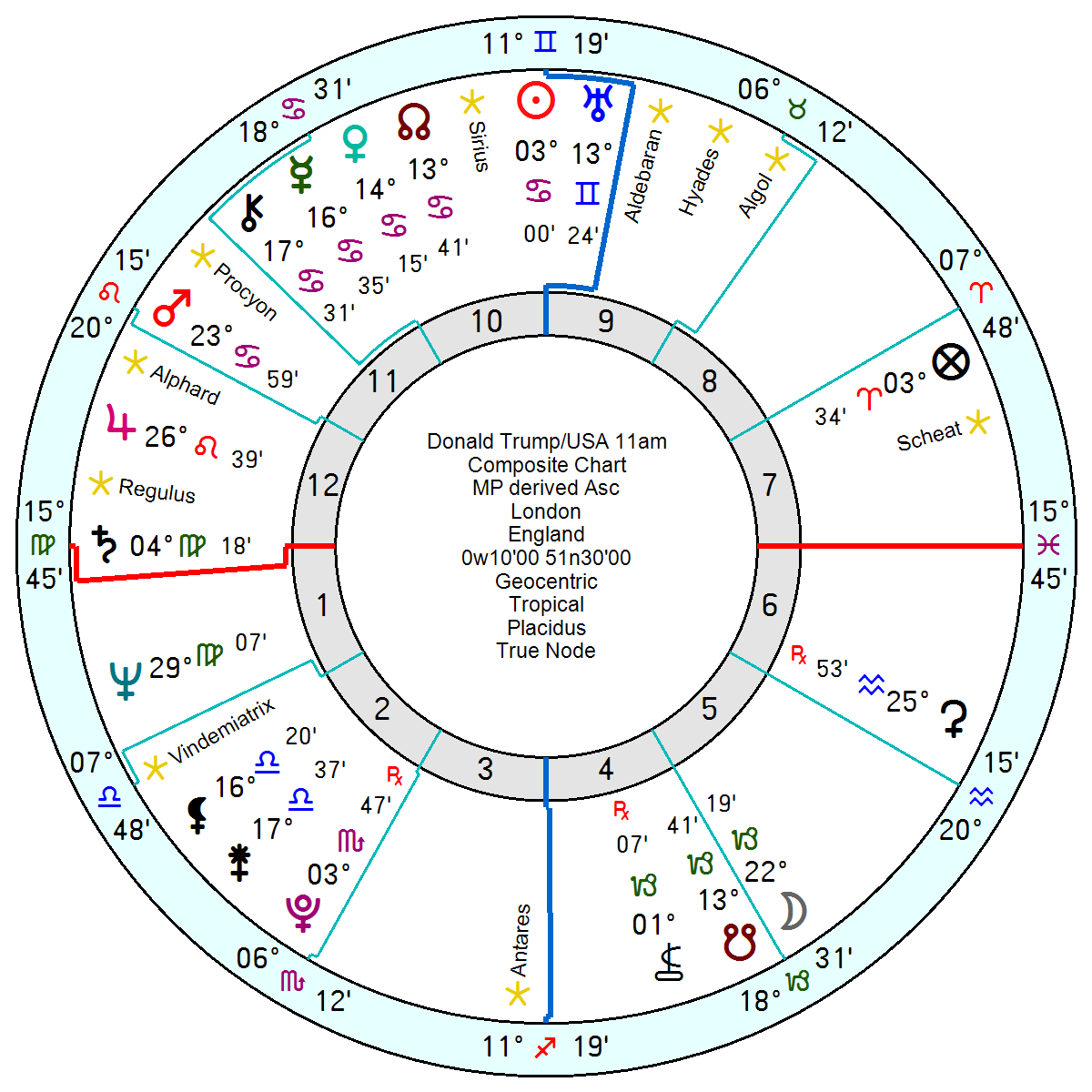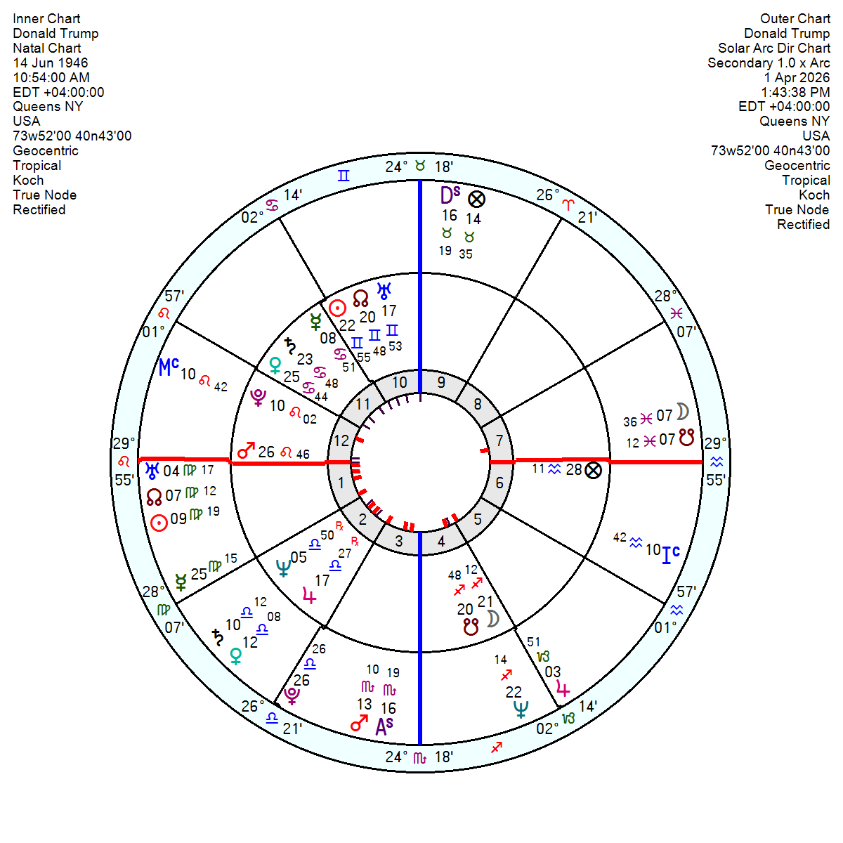 Trump’s natal chart is so wreathed in Neptunian fog until 2027 that he will remain trapped in his fantasies if not outright hallucinations. His Solar Arc Neptune has been conjunct his Moon recently and is heading to oppose his Sun exactly in 8th months though extending in influence into early 2027.