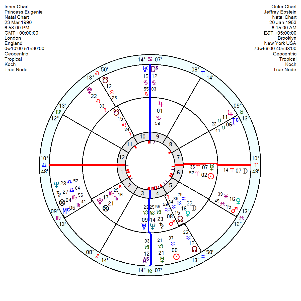 With Princess Eugenie the synastry is even more stark with Epstein’s Uranus sitting almost exactly on her Midheaven and his Jupiter in her financial 8th opposition her 2nd house Pluto. His presence will have the effect of knocking her life off its expected direction.