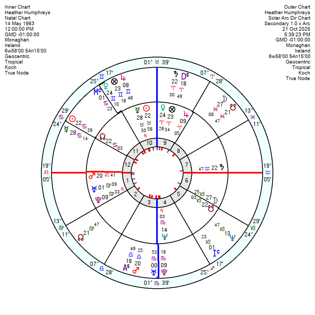 Heather Humphreys, 14 May 1963, Monaghan, Ireland, has a formidable Taurus Sun and Mercury sitting on the focal point of a Fixed T square to Mars in Leo opposition Saturn so fairly battened down and unbudgeable. She may have a Capricorn Moon. She looks go ahead in 2026 and a couple of Jupiter midpoints willing her on at the moment.