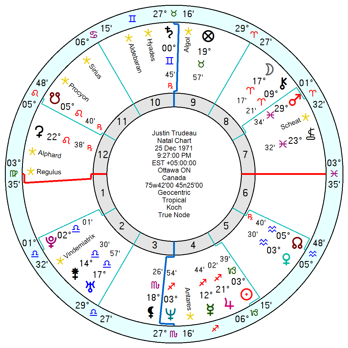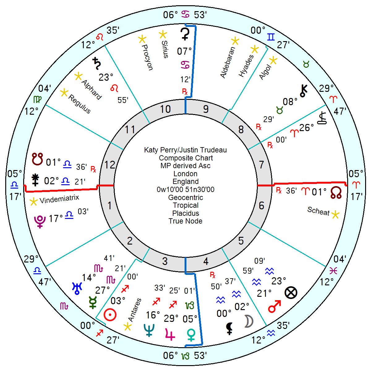 She – maybe – has moved onto Justin Trudeau, former Canadian PM, separated from his former wife since 2023, though there is some hint of it being a good photo opportunity rather than a long distance prospect. Born 25 December 1971 9.27pm Ottawa, Canada, he has his Capricorn Sun conjunct Katy’s Jupiter for an upbeat connection; with his three Sagittarius planets including Jupiter sitting comfortably with her three. But he has no Scorpio planets so may find her intensity wearing. And his Saturn sits in her 7th house conjunct her Chariklo, Algol, North Node collection which hardly sounds like a recipe for harmony.