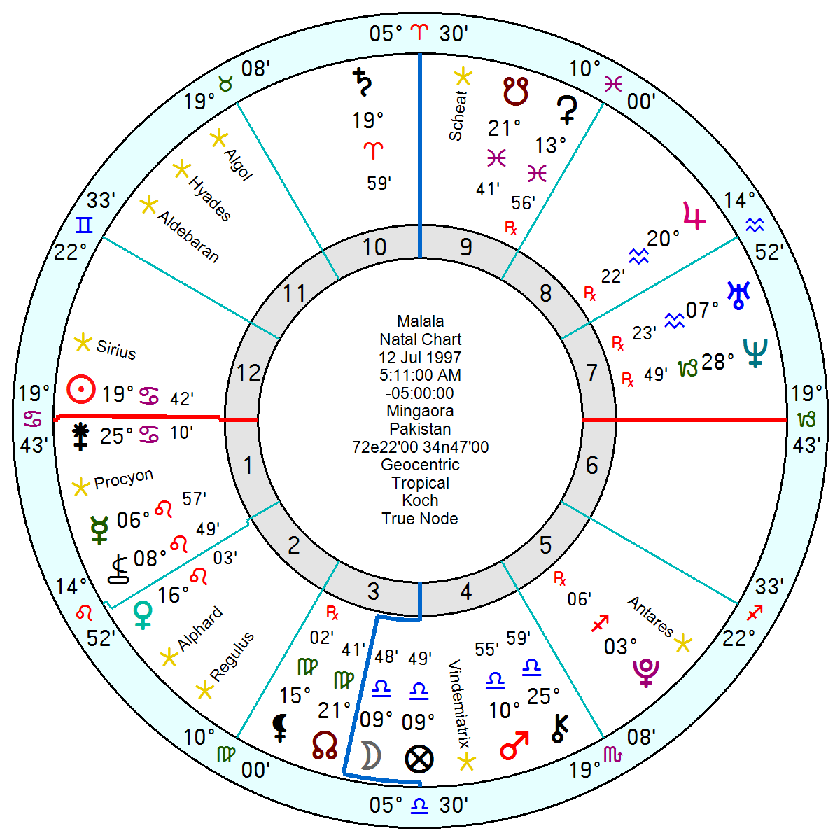 Born 12 July 1997 in Mingaora, Pakistan, birth time daybreak perhaps 5.11 am, and is a Sun Cancer on the focal point of a wide T square to Saturn in forced-to-be-self-reliant in Aries opposition Mars Moon in Libra. Mars Saturn implies both courage and life experiences which are destructive or cruel and that is focused onto a caring and ego-centric Sun. She is well designed to lead a woman-supportive movement. If her birth time is reasonably accurate then she also has an imposing 5th house Pluto making her a personality of substance out on the social scene. Her Saturn in the 10th makes her a good organiser.