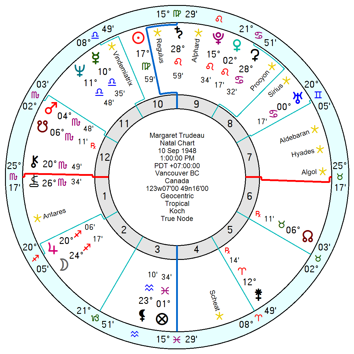 Margaret Trudeau, 10 September 1948 1pm Vancouver, Canada, had a 10th house Virgo square square Jupiter Moon in Sagittarius so designed for a public lifestyle, enthusiastic and super-optimistic. Her Venus in Leo was in a ramped up square to Mars in Scorpio and she had a her 8th house Uranus opposition her Moon which would tend to make her act erratically especially in her emotional life.