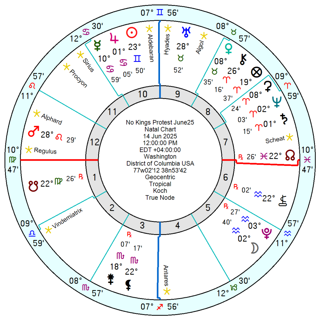 Yesterday’s demos had tr Jupiter conjunct the Mars of the 2025 Inauguration chart which is significant – since that Mars is opposition Mercury and square the 6th house Moon pointing to an angry populace which was always going to make its displeasure felt at some point. The tr North Node was also conjunct the Inauguration Venus Saturn conjunction in Pisces – which echoes Trump’s natal chart with its wounded and unloveable Saturn conjunct Venus.