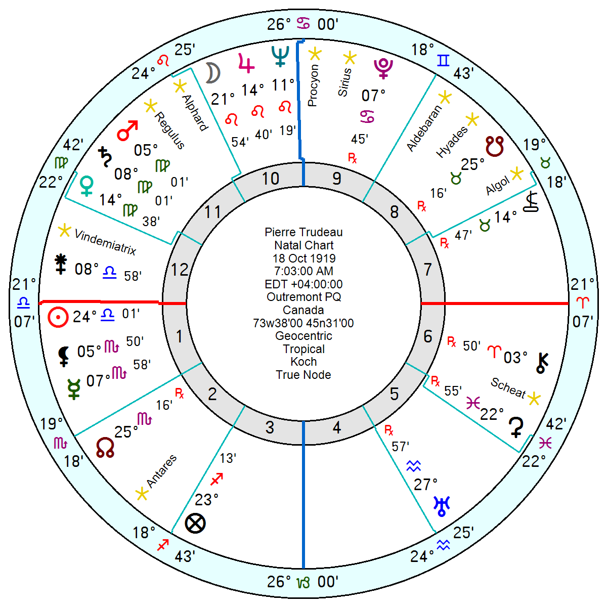 Pierre 18 October 1919 7.03am Outremont, PQ, Canada, had a Libra Sun on his Ascendant with a flashy (and showbizzy) Neptune, Jupiter, Moon in Leo in his 10th. His Moon opposed Uranus in his romantic 5th – so he would be inclined to play the field. His Venus in Virgo was conjunct Saturn which was conjunct Mars and sextile Pluto which would give him, in addition to a taste for hard work, an inclination for earthy encounters.