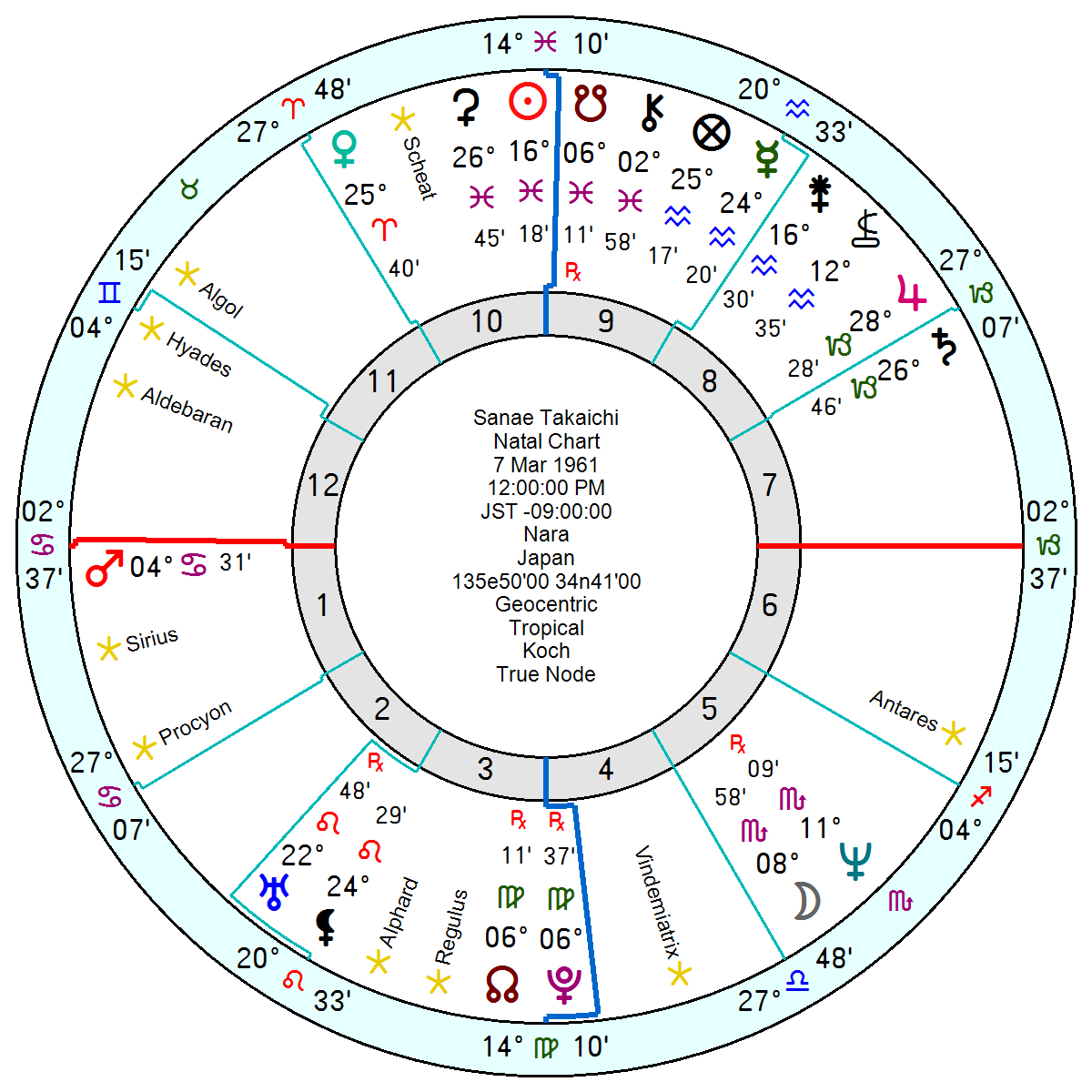 She was born 7 March 1961 in Nara, Japan, and has a Pisces Sun trine Neptune (Moon) in Scorpio which watery combination is very unlike Maggie Thatcher. But she does have her Pluto North Node sextile Mars which will give her courage and steely determination plus Jupiter Saturn in Capricorn square Venus in Aries so she won’t be backwards about pushing her causes.