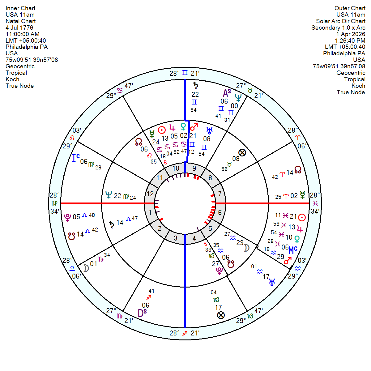 Around the same time, April 2026, on the USA chart the Solar Arc Sun will square the Mars exactly which will coincide with at least a noisy clash or a major setback which feels like a collision.