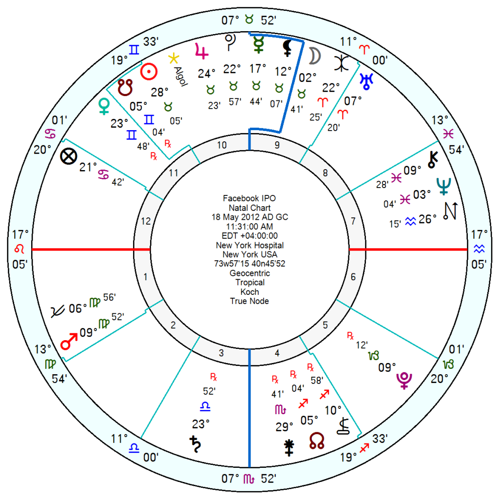 The Facebook IPO, 18 May 2012 11.31 am New York, looks seriously rattled now with tr Uranus conjunct the Sun and nerve-stretched from June onwards with tranches of unwanted publicity as tr Uranus starts to square the Neptune and then the opposition to Mars, running on for several years. The Solar Arc Saturn is opposition the Midheaven at the moment as it is pulled up short and tr Pluto will take up the cudgels through 2027/2028 forcing a change of direction. With a moving yod of the natal Mars sextile Solar Arc Saturn inconjunct Uranus – so paralysed at what will be a game-changing period.