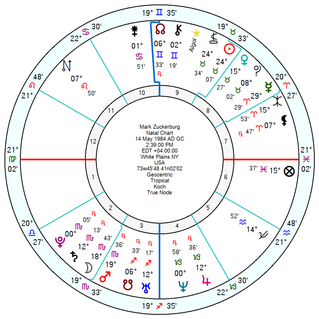 Mark Zuckerburg, 14 May 1984 2.39 pm White Plains, New York, will feel as if he has been holed below the waterline with his Solar Arc Mars conjunct his 4th house Neptune later this year and through 2027, giving him an unaccustomed sense of panicky failure. 2027 looks high uncertain and consumed with anxiety as his SA Neptune squares his Saturn; and 2028 will seem him in a total upheaval as his SA Pluto is conjunct his Uranus.