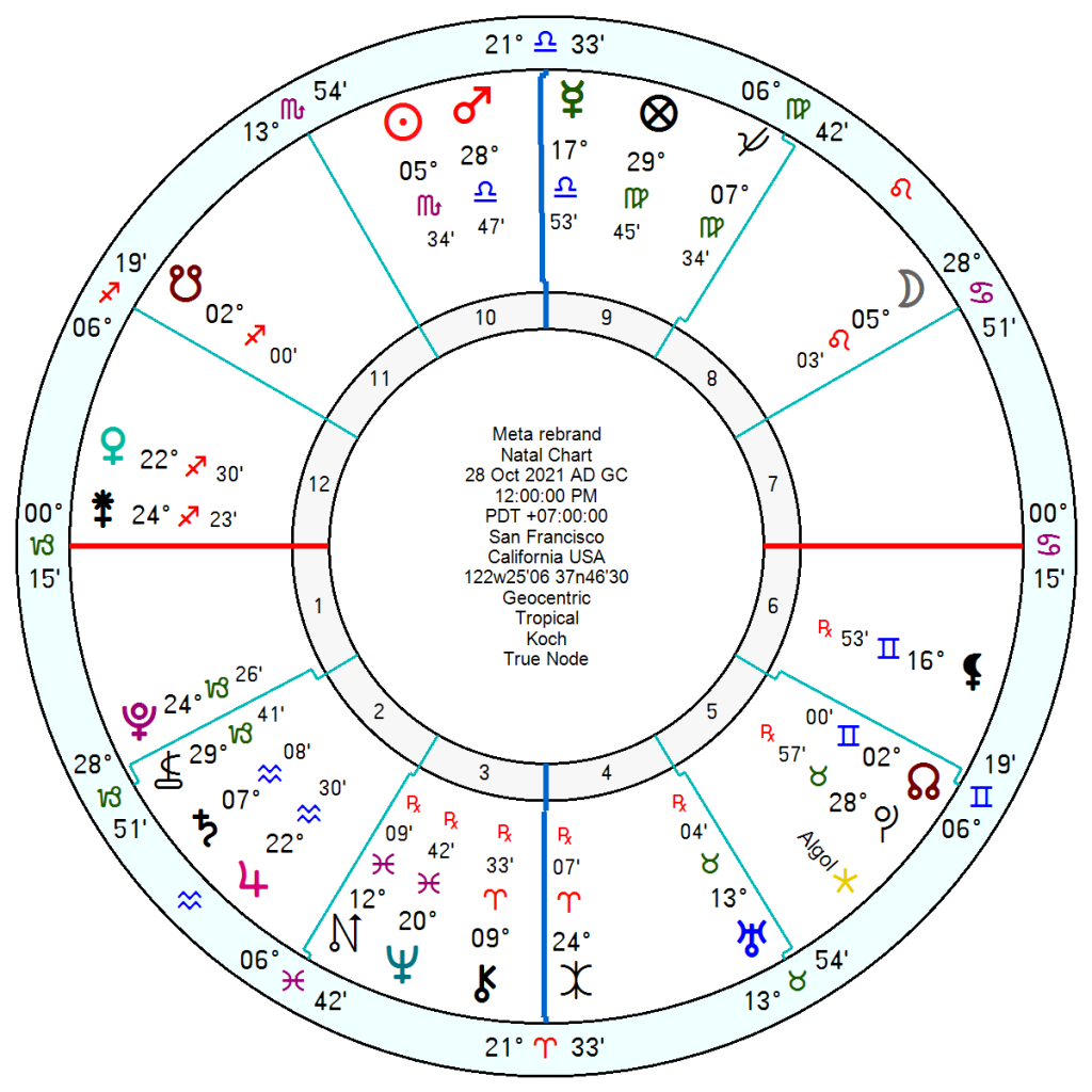Meta, 28 October 2021, has a Scorpio Sun at 5 degrees square Saturn at 7 degrees which will be forced into a painful three year period of having to leave old practices behind with tr Pluto square the Sun this year and next; and then conjunct Saturn in 2027/28. 2028 also has a car-crash Solar Arc Mars conjunct Sun.