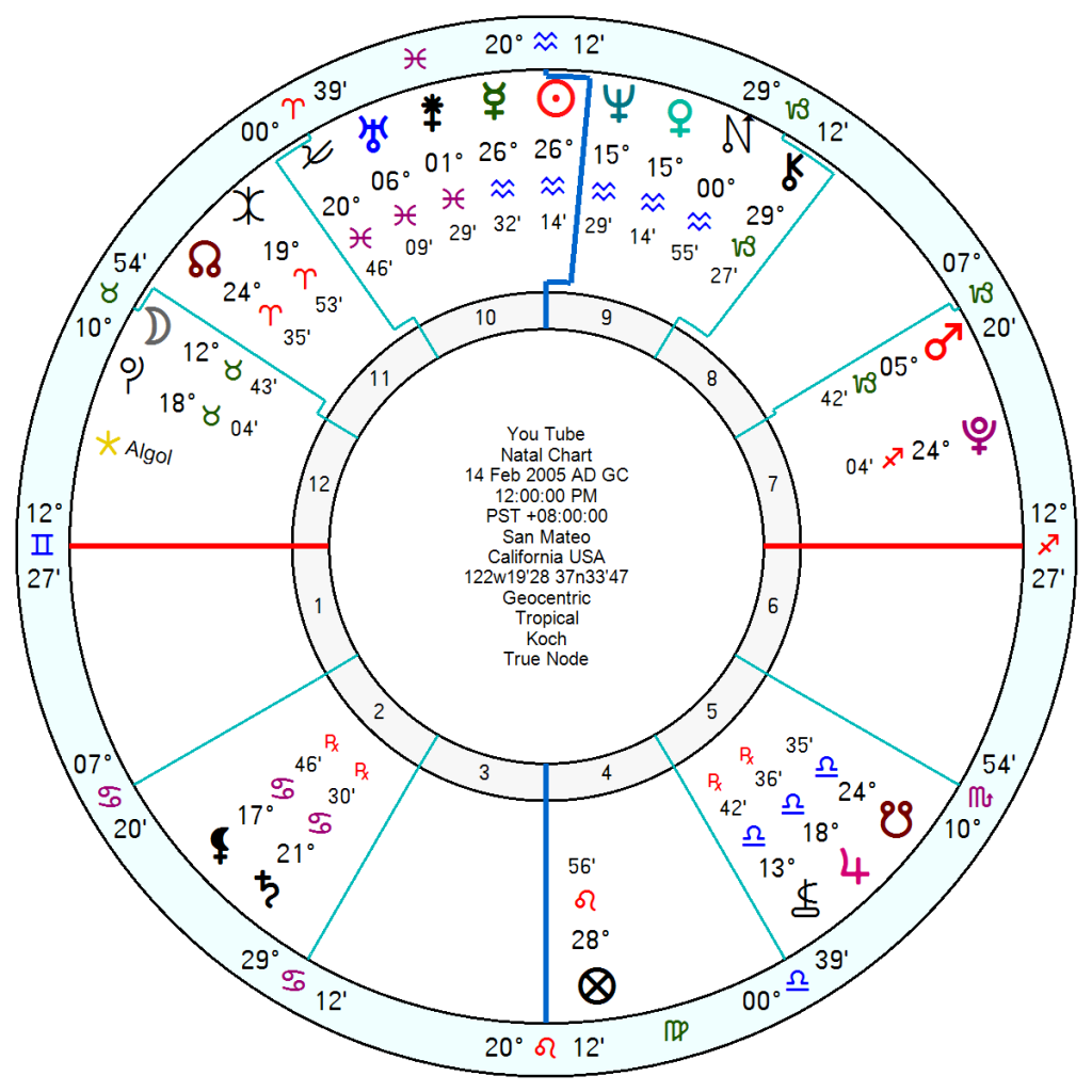 Youtube, 14 February 2005, is in no better shape with a panicky/high anxiety Solar Arc Neptune conjunct Uranus now; the recent Eclipse conjunct its late Aquarius Sun Mercury for a crisis and forced changes. 2027 will have the panicky-failure tr Neptune square its Mars with a jolting tr Uranus square Uranus – and a hugely uncertain 2029 with SA Saturn opposition Neptune.