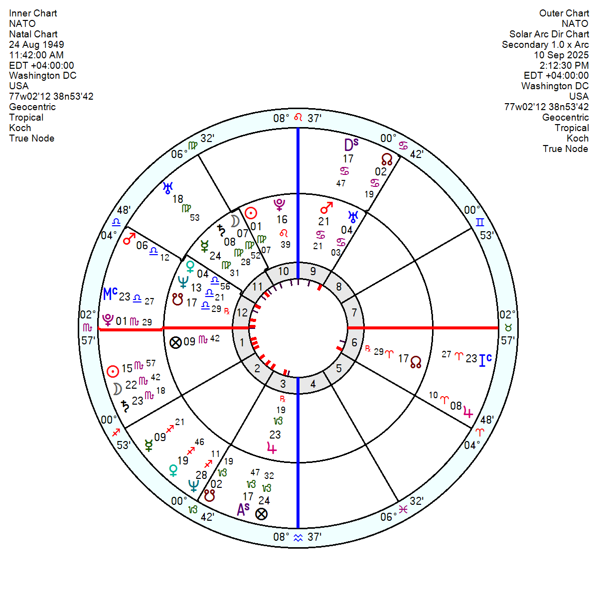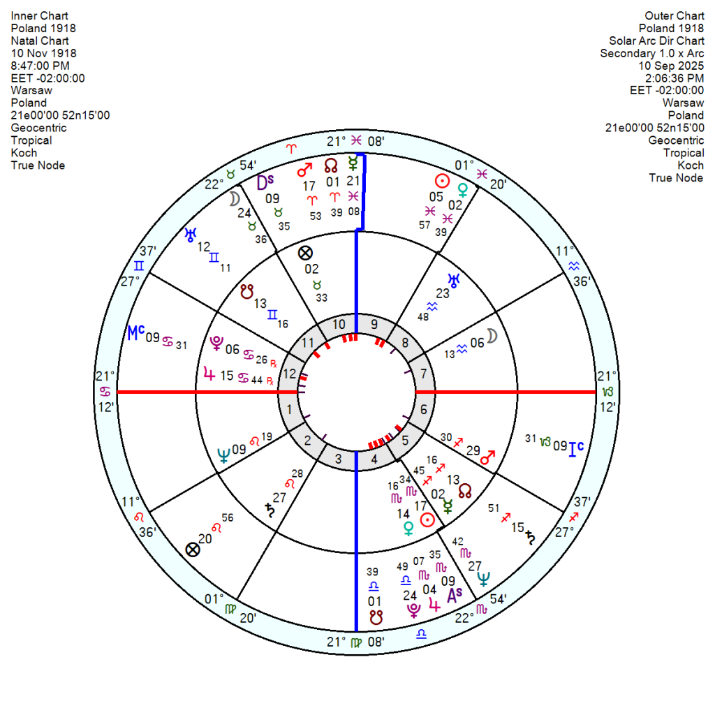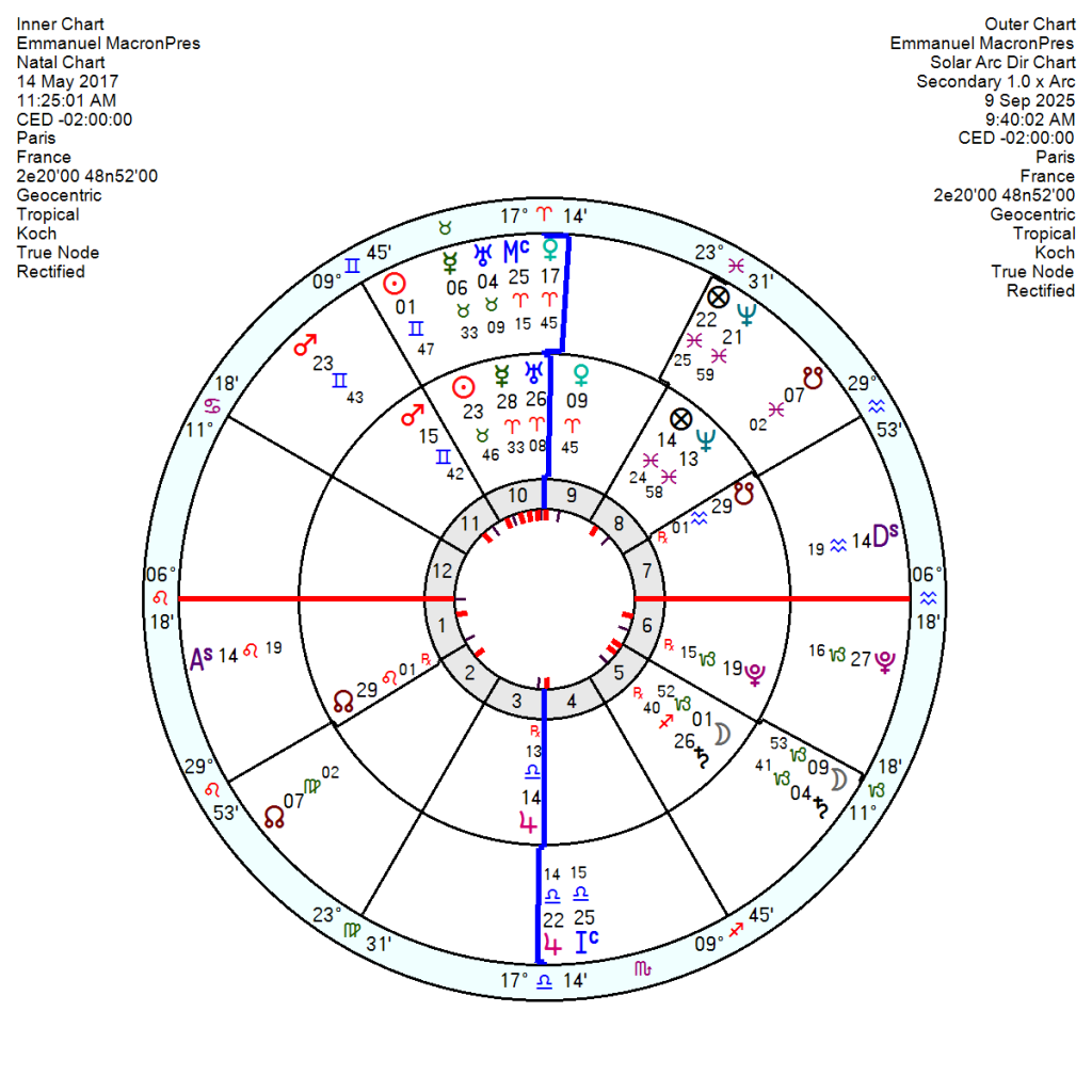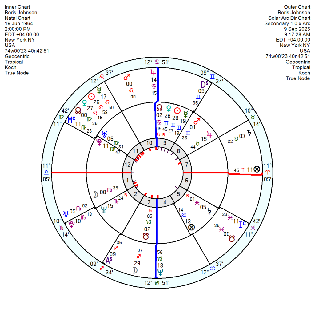 On the USA chart the Solar Arc Saturn is almost exactly square the US Neptune for a moment of worry and uncertainty – with another 20 months of similar as the SA Sun moves to square the USA Mars in early 2026 and then opposes the USA Neptune in spring 2027 – so this longish phase of high anxiety and confusion which started in 2024 won’t lessen in effect until almost the end of 2027.
