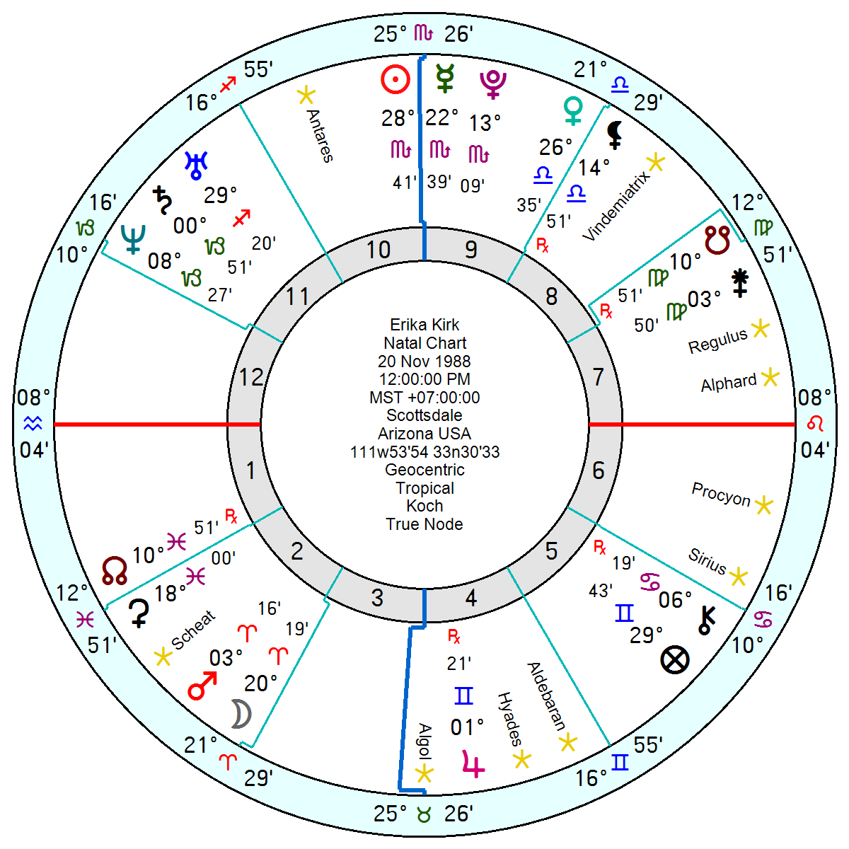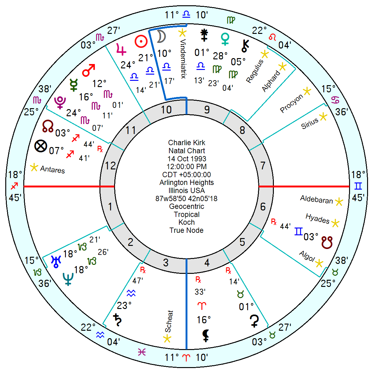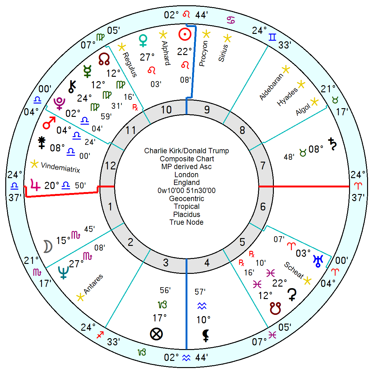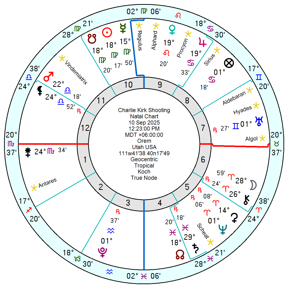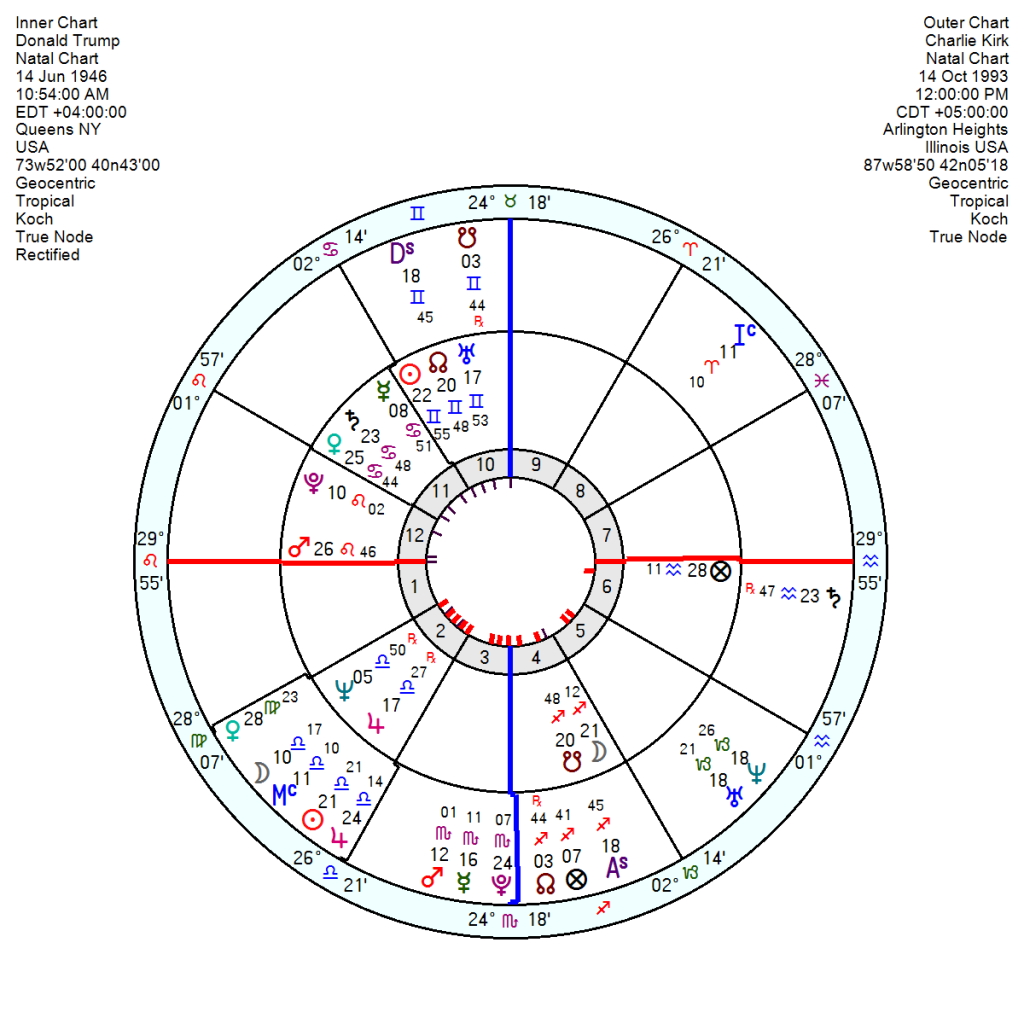 What is astro-puzzling is his chart comparison with Trump whose faithful bondsman he has been since the 2016 election. Admittedly Kirk’s Sun Jupiter in Libra and Saturn in Aquarius chime well with DT’s Gemini Sun. But everything else is heavily conflicted. Kirk’s Saturn opposes DT’s Mars and Kirk’s Pluto is conjunct DT’s IC. Kirk’s Mars squares DT’s Pluto and Kirk’s Uranus Neptune opposes DT’s Saturn. Put them in the same room for a week and there would have been trouble.