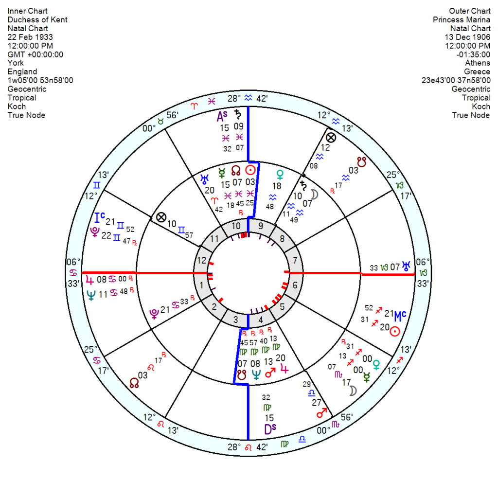 She has her Sun, Mercury and Pluto spread out through Scorpio with her Sun in an expansive opposition to Jupiter in communicative Gemini. She also has the triple conjunction of Neptune, Saturn Uranus in an excitable square to Mars in pro-active Aries plus a go-ahead Aries Moon. Her Venus in Libra was conjunct her husband’s Sun Jupiter for an affectionate bond. With her Scorpio planets sitting across his Mars, Mercury, Pluto in Scorpio – which would not be the easiest or most light-hearted combination but clearly their joint devotion to their cause was what drove them on. Their relationship chart has a possessive, influential, controlling composite Sun, Pluto Mercury conjunction in a power-couple square to Jupiter. There was also a true-believer Uranus Neptune conjunction and a hard-edged Mars Saturn conjunction hinting at a power-imbalance in the relationship. Though from the outside both look as driven as the other.