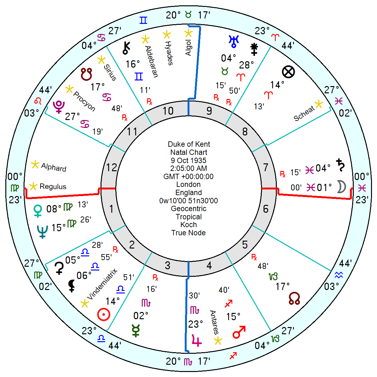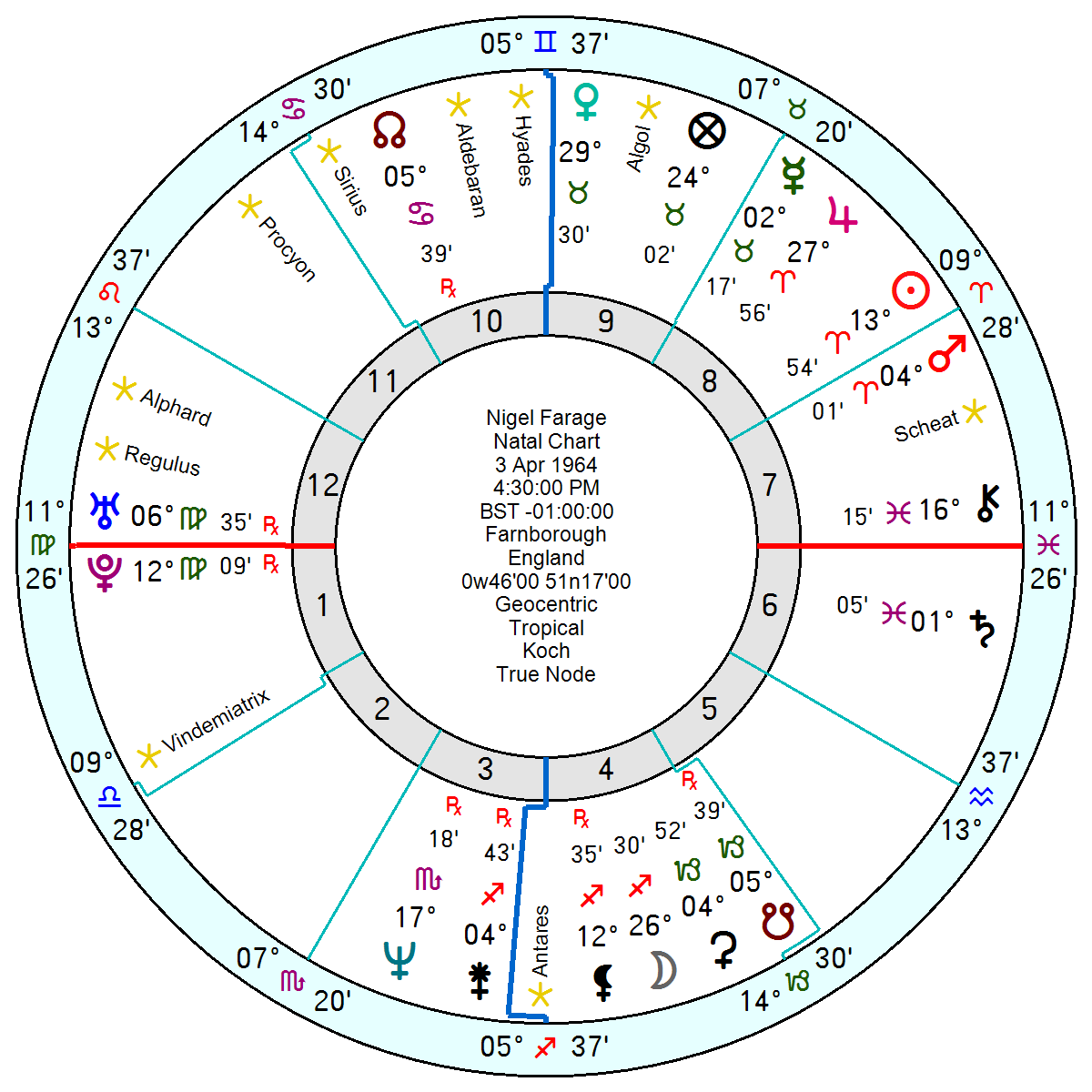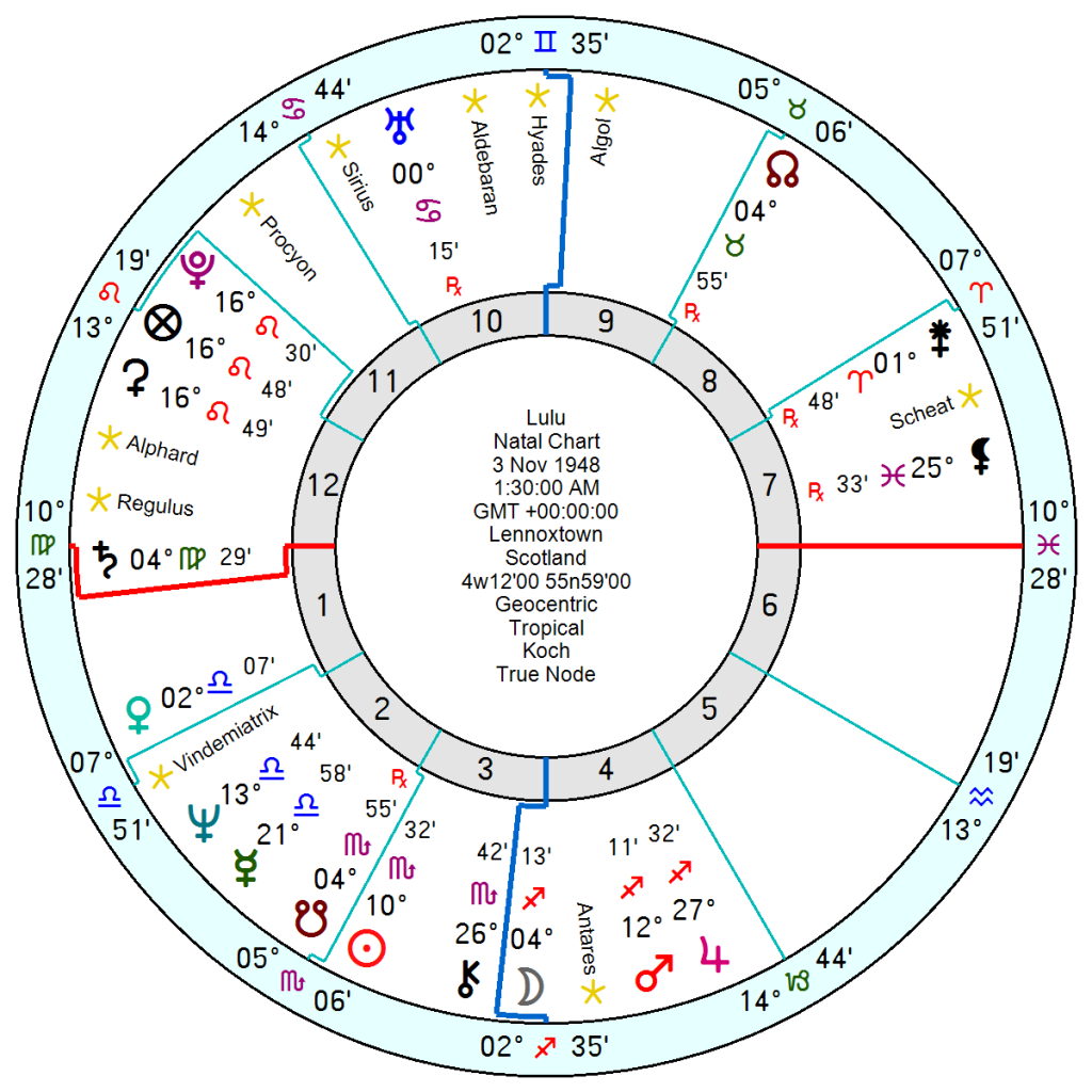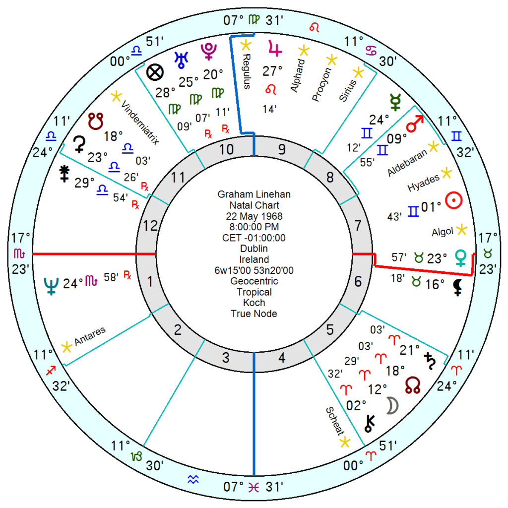 His Venus in late Virgo was about to catch this month’s Solar Eclipse and he has a couple of Mars midpoints under pressure from tr Pluto as well as tr Neptune Saturn hard aspects.