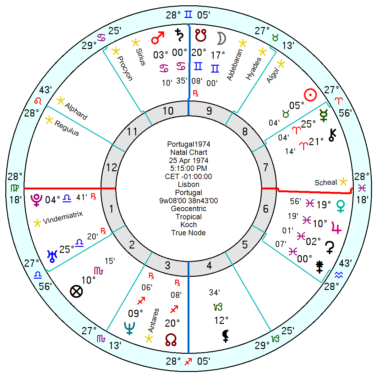 The Portugal country chart, 25 April 1974 5.15pm Lisbon has an accident-prone Mars Saturn conjunction in Cancer square Pluto which is catching the uncertain, undermining tr Neptune Saturn hard aspects now and right through the next three years. So it may be symbolic of more challenges to come.