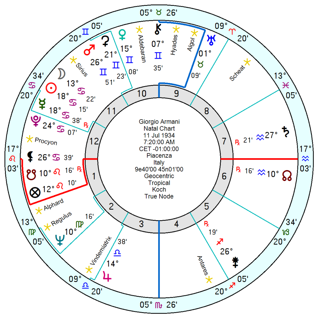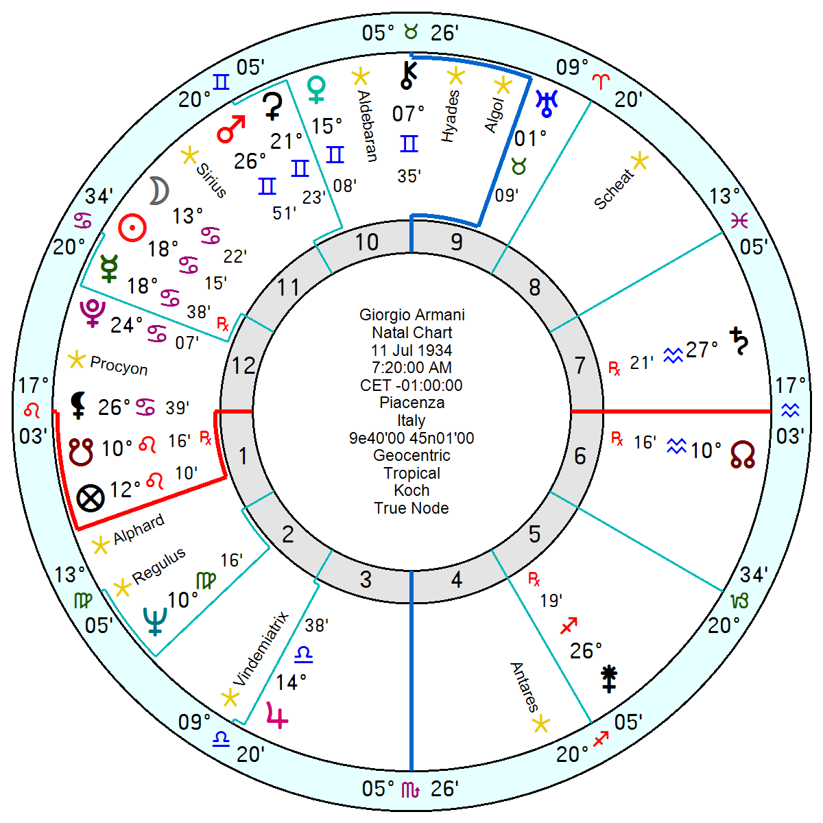 His Cancer Moon fittingly was conjunct Sirius hinting at success in business, influential friends, good health. His mother’s influence on his creative talents was obviously critical.