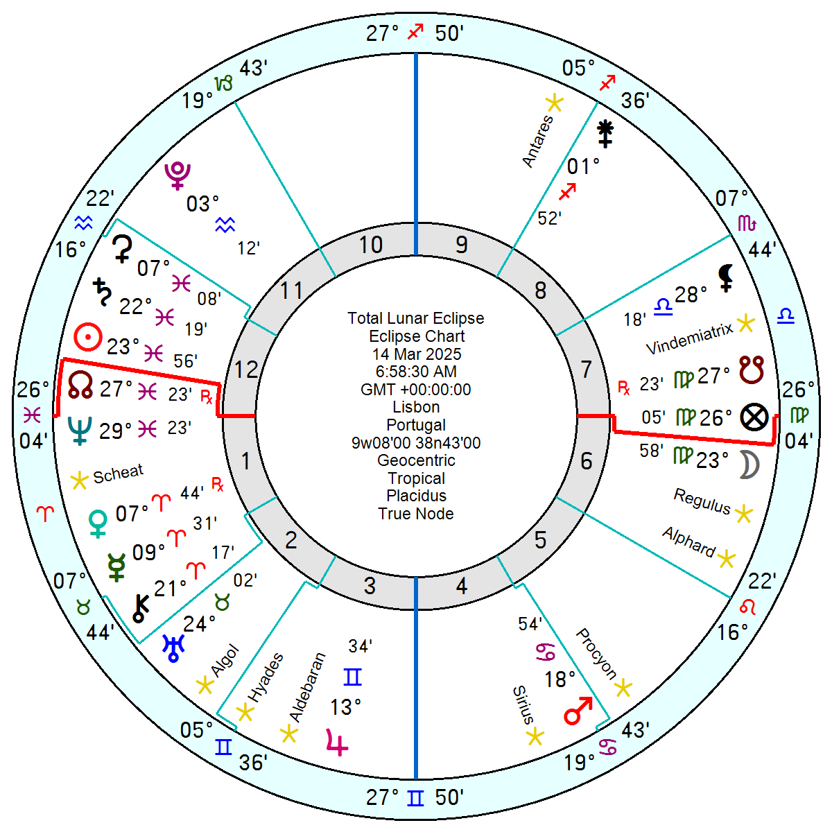 The previous Lunar Eclipse of March 2025 set for Lisbon has the Virgo Eclipsed Full Moon opposition Neptune hovering across the Descendant/Ascendant axis so pointing to a significant event ahead.