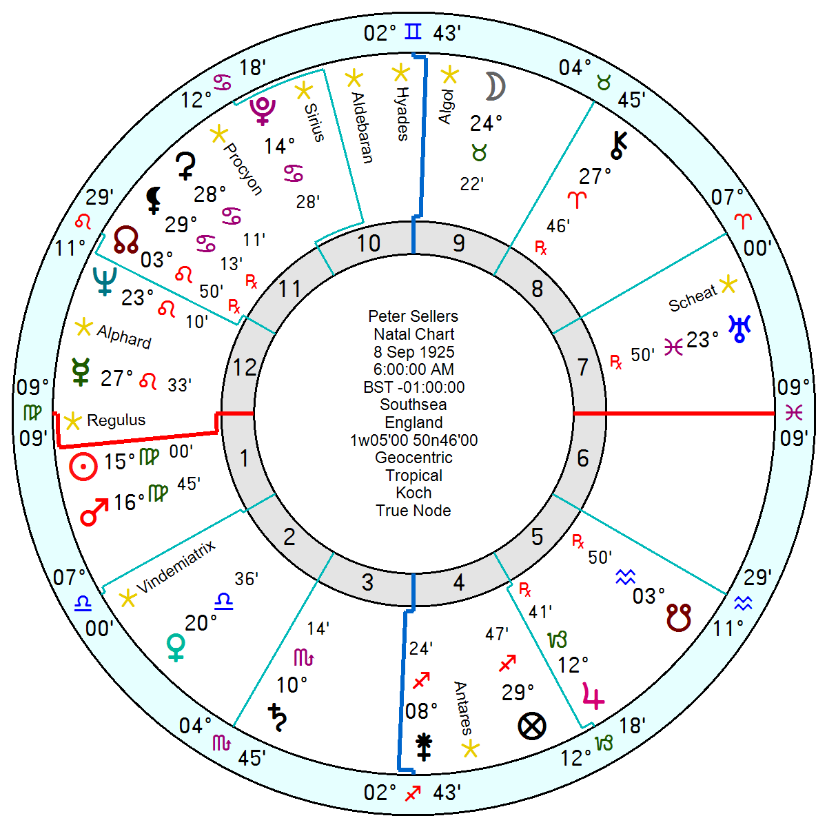 He had 1st house Sun Mars in Virgo which was part of a talented and confident Half Grand Sextile of Pluto opposition Jupiter in Capricorn in his performing 5th house sextile/trine Sun Mars and sextile/trine Saturn in intense Scorpio. He also had two yods. One with creative, escapist Neptune in his 12th sextile a charming Venus in Libra inconjunct a 7th house Uranus – one reason for his revolving marriages. Uranus on a yod tends to be nervy, rebellious, contrary, a trailblazer in a creative fashion and a disruptor. It was the best and worst of him.