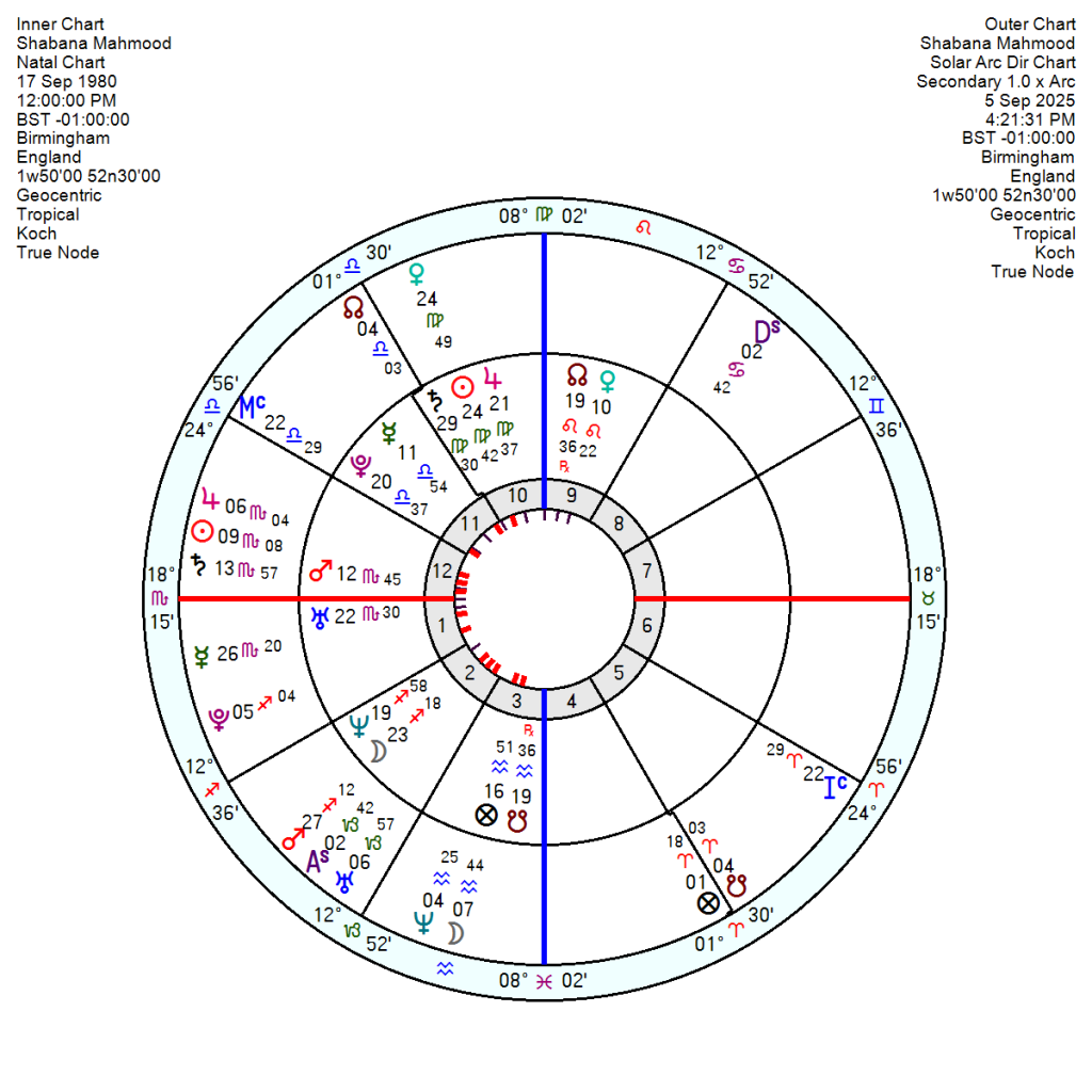 Shabana Mahmood, 17 September 1980, is a Sun Jupiter Saturn in Virgo square Neptune; and a determined Mars in Scorpio and Uranus in Scorpio square North Node in Leo and Venus.