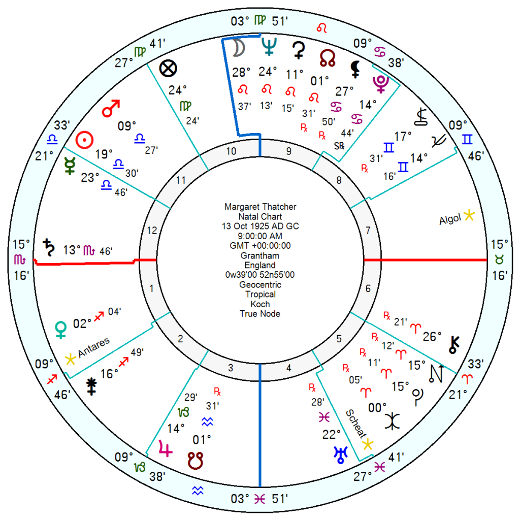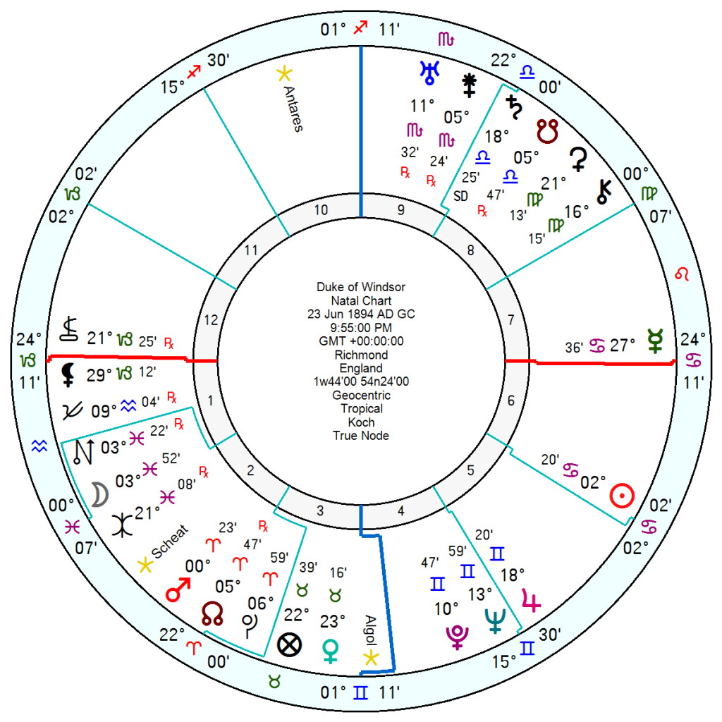 Astrology King: Saturn conjunct Antares: Materialistic, dishonest through circumstances created by the environment, many failures, hampered by relatives, unfavourable for domestic matters, much sickness to and sorrow from children.