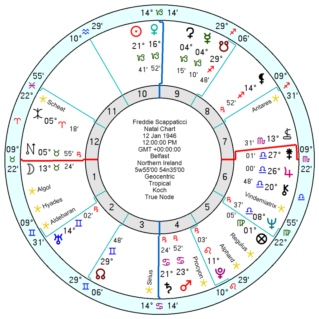 Freddie Scappaticci, 12 January 1946, Belfast born of Italian parents, who died in 2023, certainly had a chart hinting of the potential for abusive behaviour with a Capricorn Sun Venus opposition Saturn Mars in Cancer square an expansive Jupiter. Over-confident, hard-edged, short-fused with a penchant for the military and cruelty. Mars Saturn is the historical astrological signature for assassinations. He also had a Taurus Moon square Pluto which would do nothing to soften his approach.