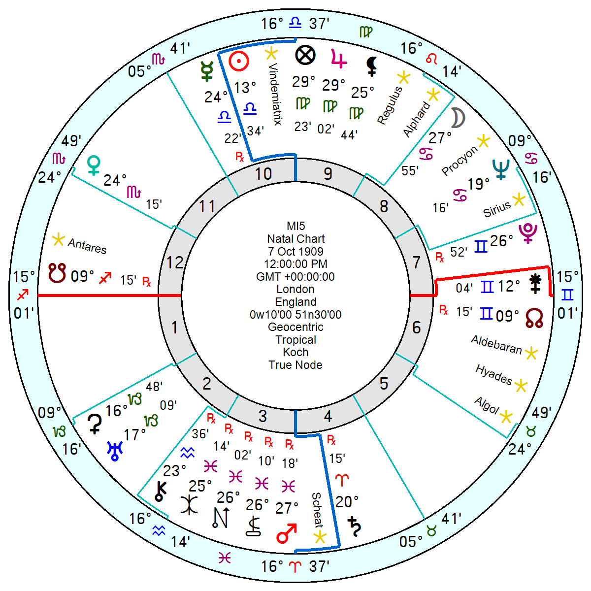 What intrigues me is the chart for MI5 (the UK Security Services) founded 7 October 1909 which has a Cardinal Grand Cross of a Libra Sun Mercury opposition Saturn in Aries square Neptune in Cancer opposition Uranus. Cardinal Grand Crosses hint at a lifestyle of revolving crises, in this case involving subterfuge (Neptune) and fanaticism (Uranus Neptune).
