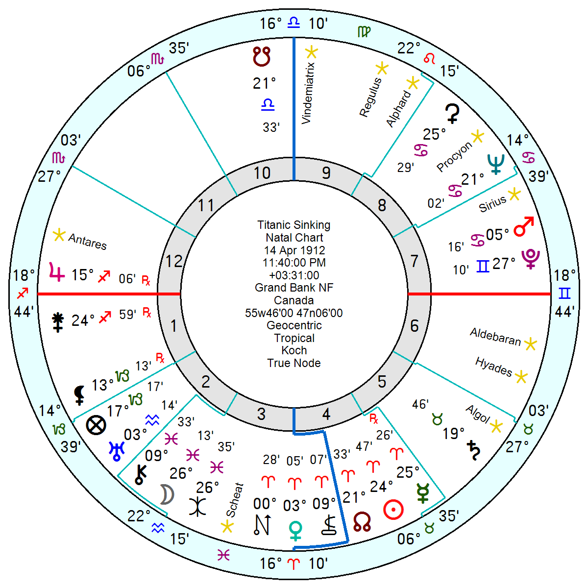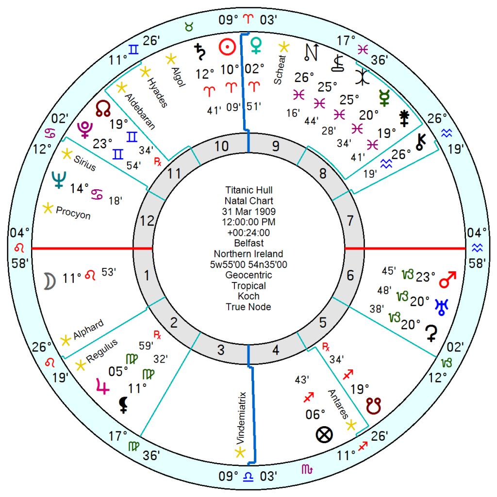 1909 with the same Fixed stars in place oversaw the laying of the Titanic hull – all four Fixed Stars were square Pluto. When it sank in 1912 the Fixed stars had moved to different positions but the late Pisces Moon was exactly conjunct Eris and within two degrees of Scheat, the shipwrecking Fixed star.