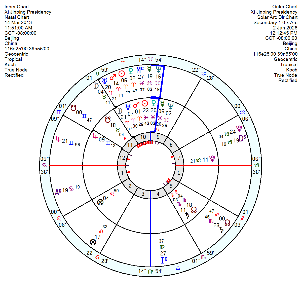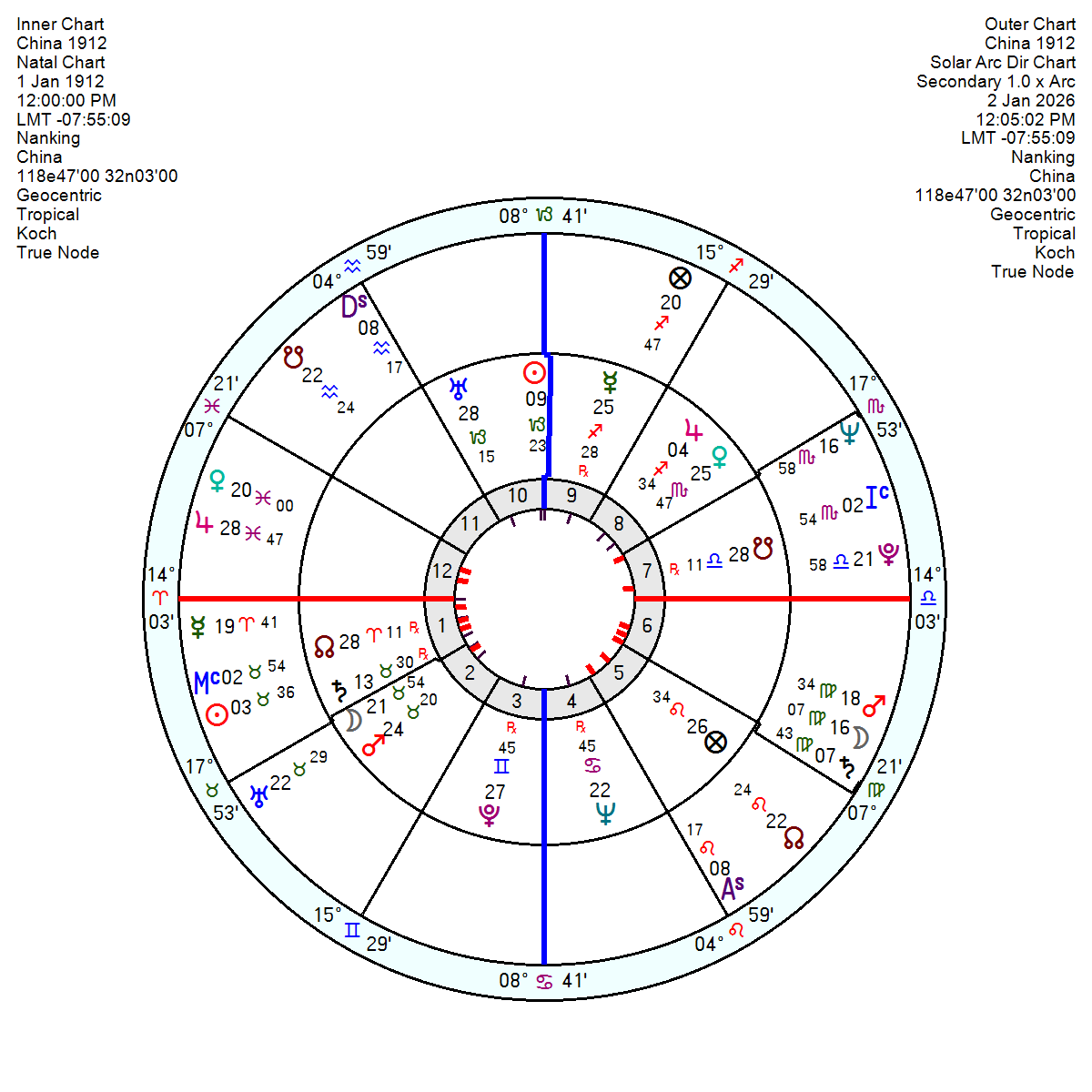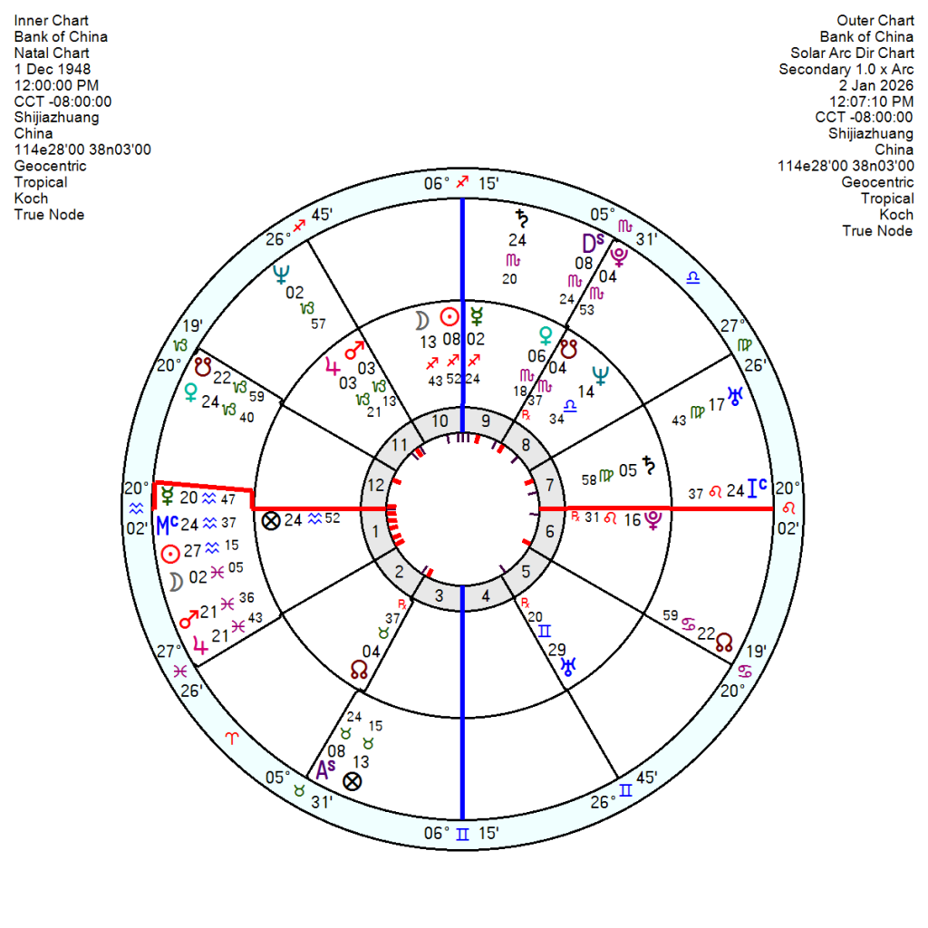 The China 1 January 1912 chart, no time, shows late 2027 into 2028 as fairly calamitous as the Solar Arc Uranus makes an explosive conjunction to the Mars in Taurus (so could be finance related or a conflict). Before then tr Uranus opposition the Jupiter mid 2026 into 2027 will provide a dash of luck.