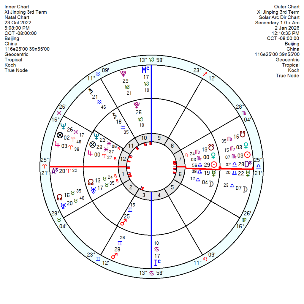 Xi Jinping’s 3rd Term, 23 October 2022 5.08pm Beijing, for all his trumpet blowing does look stuck with the Solar Arc Pluto closing the square to the Sun to exact within months – which could ramp up his need to be in control, but usually does not end well. Tr Saturn Neptune will also oppose the 6th house Moon through 2026, hinting at a discontented populace and government workers, perhaps health issues.