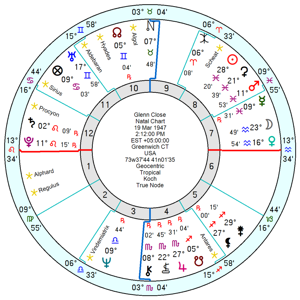 Without ever seeing her chart, my sense was that Glenn Close is a Plutonian/Aquarian version of Meryl Streep. Both dive deep and embody their role in a film, but, oh my…. Glenn takes it to a whole other level!