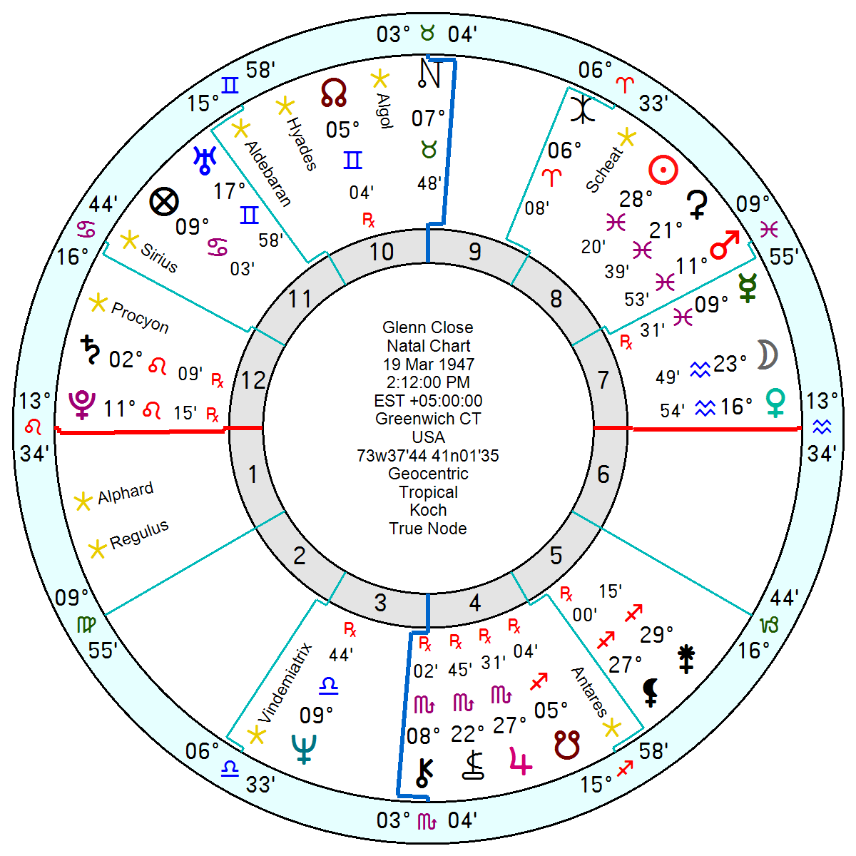 I was struck by how a few important placements in her chart are similar to my closest female friend.. born 4 months earlier. The Pluto/Saturn in the 12th and the strong placement of Nessos. For my friend it is Nessos conj the Moon. She came from a very abusive childhood and has done more honest, raw and compassionate work on herself than anyone I know. She KNOWS how dark she can be and has found ways to own and transform that. She is the most trustworthy person I know. Glenn’s choice of film roles seems to be her way of processing her internal, raw, shadow emotions/thoughts, etc.