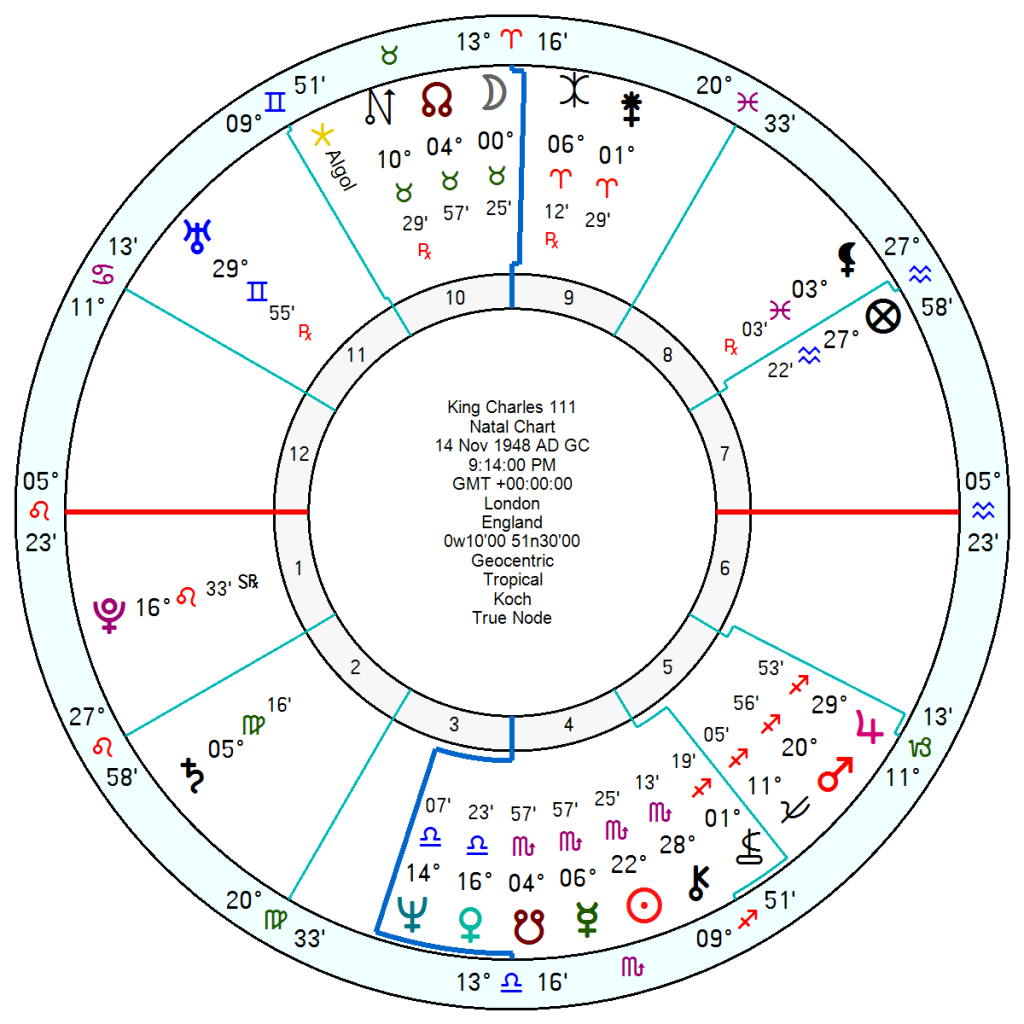 Charles’ personal chart, 14 November 1948 9.14pm London, was last year labouring under the discouraging Solar Arc Saturn conjunct his Sun as his cancer treatment got under way. More recently tr Neptune and tr Saturn were denting his joie de vivre as they squared his Jupiter opposition Uranus. That is now out of the way but he is heading for tr Uranus in a jangled, high-tension square to his Saturn in his 2nd house of personal finances from this August onwards into 2027.