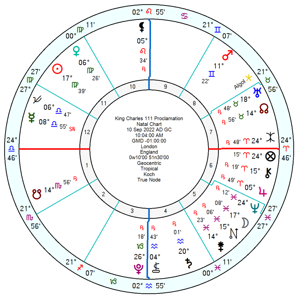 The proclamation of Charles as king, 10 September 2022 10.04am London, does have Pluto in the 3rd house of siblings; Saturn and Chariklo (endless suffering) in the 4th house of family; and Moon Nessus (= the bad boy centaur) in the 5th house of children.