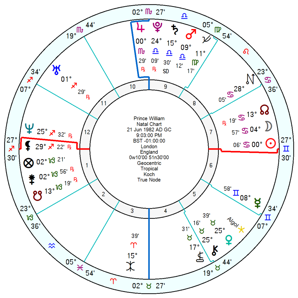 Prince William, 21 June 1982 9.03 am London, is on his midlife crisis with tr Uranus opposing his Uranus in 2026, so maybe hankering back to old unfulfilled ambitions. But he will be drifting a little with tr Neptune (and briefly tr Saturn) square his Sun Moon in Cancer on and off until late 2027. Neptune squares his Moon this year for the first time late May to mid August. That may be balanced out by his Progressed Mars moving closer to his Midheaven over the next year (and conjunct his Prog Jupiter) which will give him an ambitious lift.
