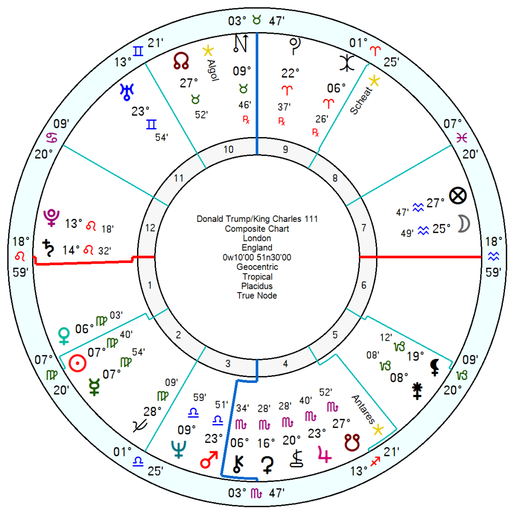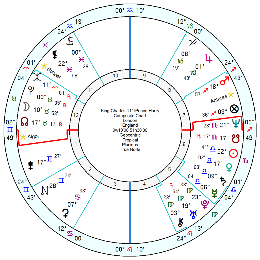 Charles’ relationship chart with Harry does have a 2 degree Gemini Ascendant so there may be more definitive upheavals from June onwards as tr Uranus moves across into their composite 1st house – which suggests more separation rather than less in the time thereafter.